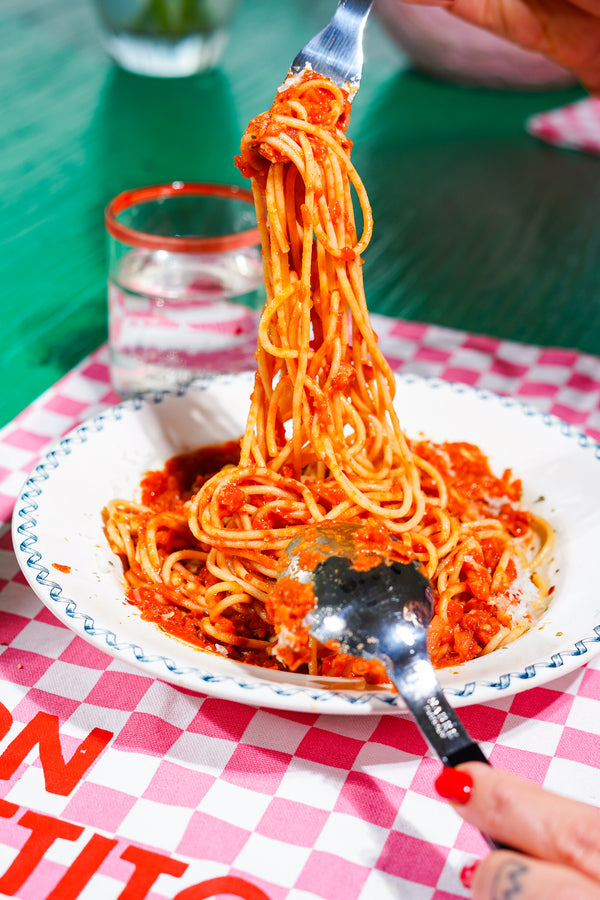 Serveer de pasta met een flinke lepel saus erbovenop. Extra chili flakes, oregano en wat druppels olie. Werk eventueel af met wat geraspte kaas.