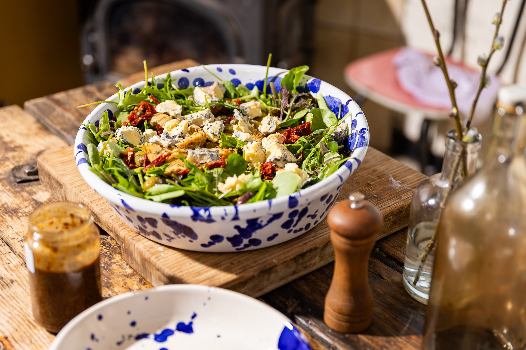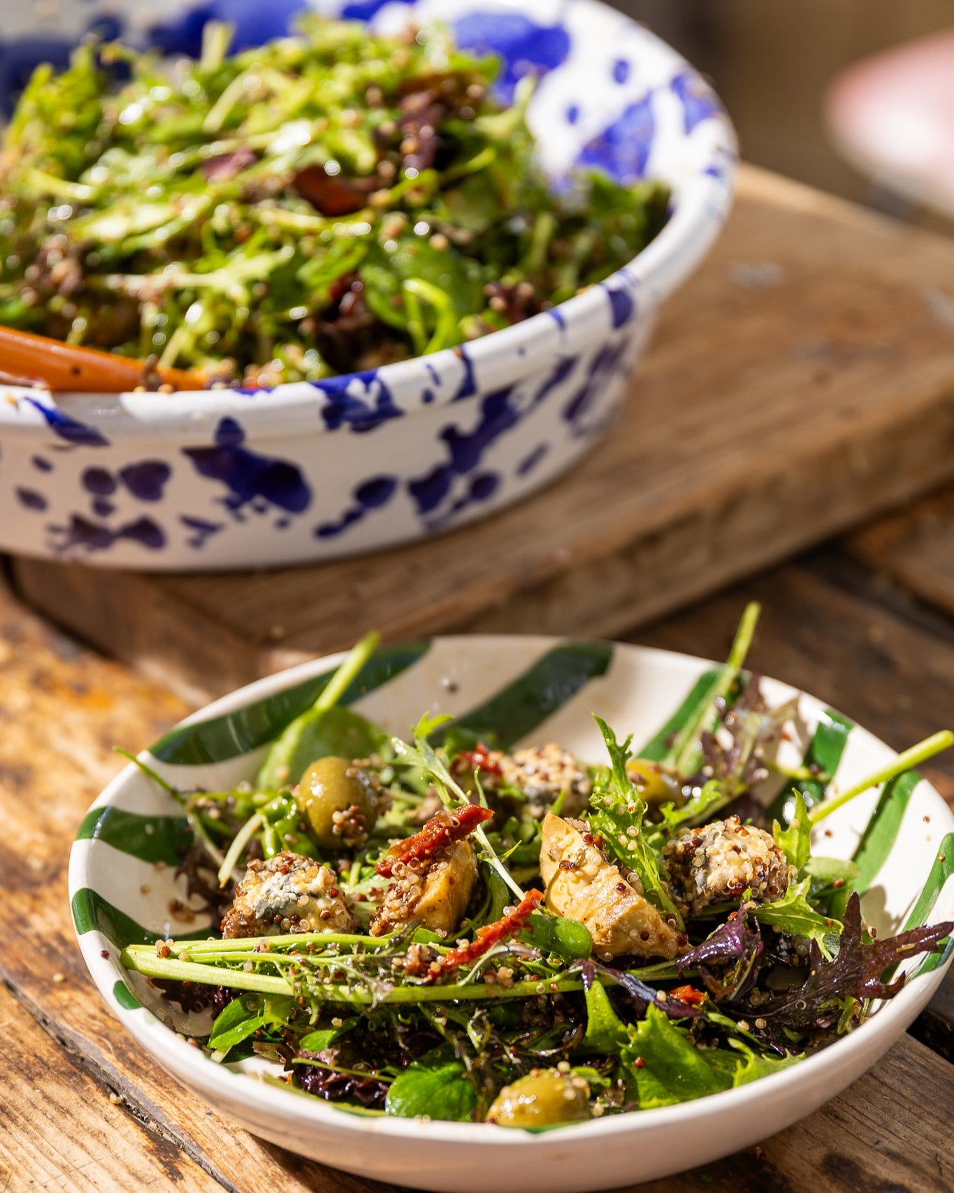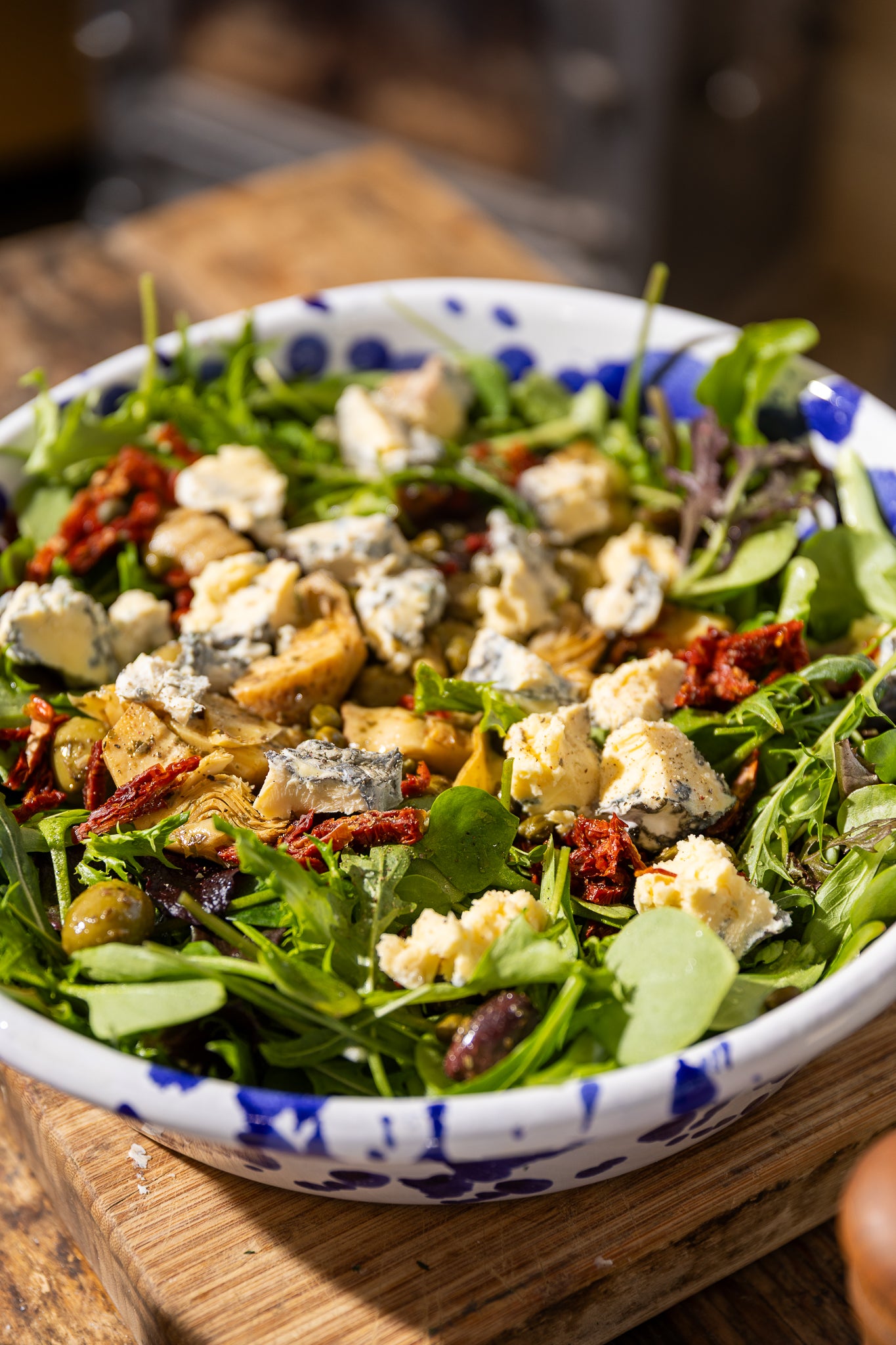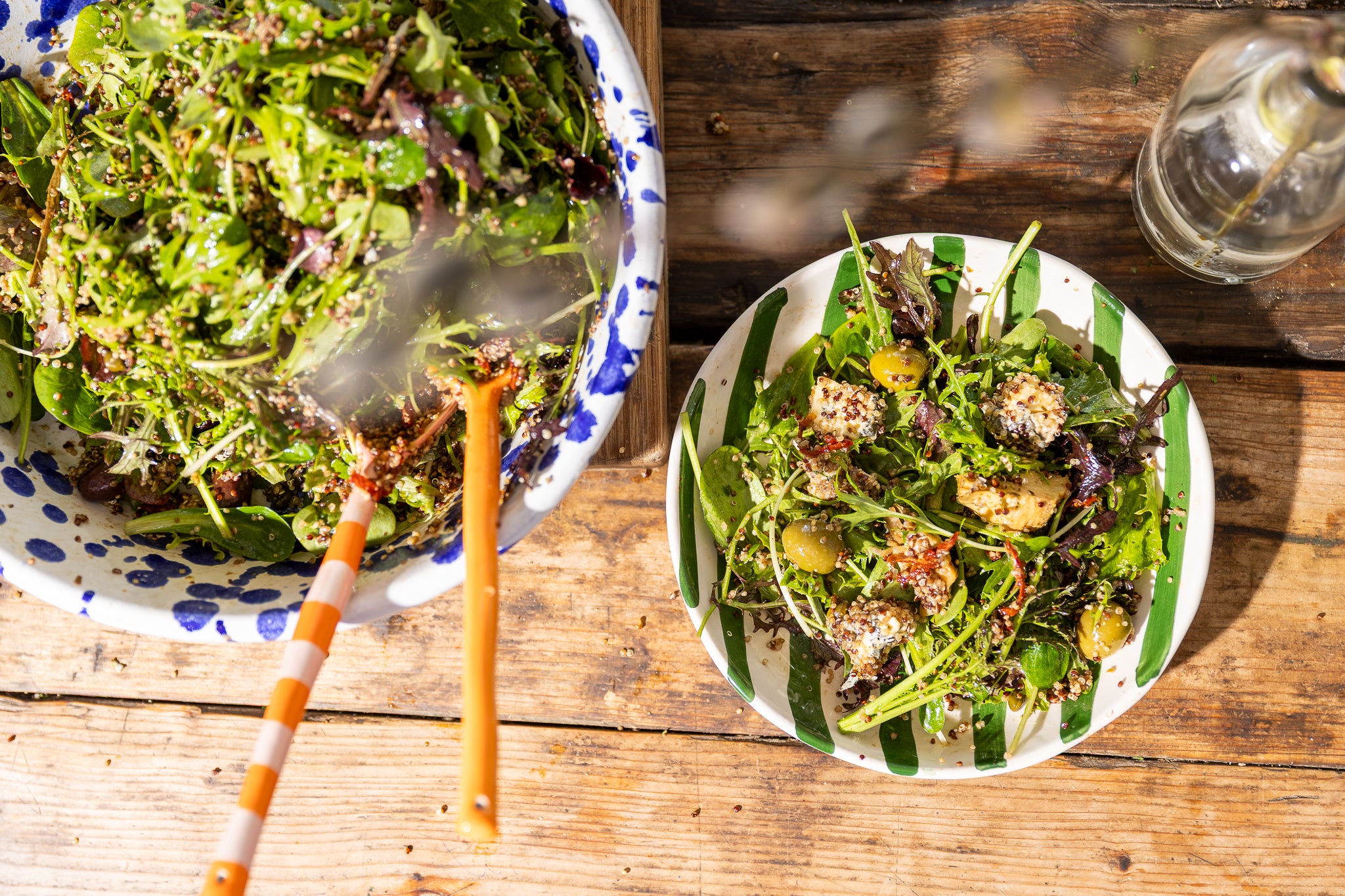 - 700 g gemengde sla (rucola, mizuna, bladsla, veldsla, barbarakers, …)