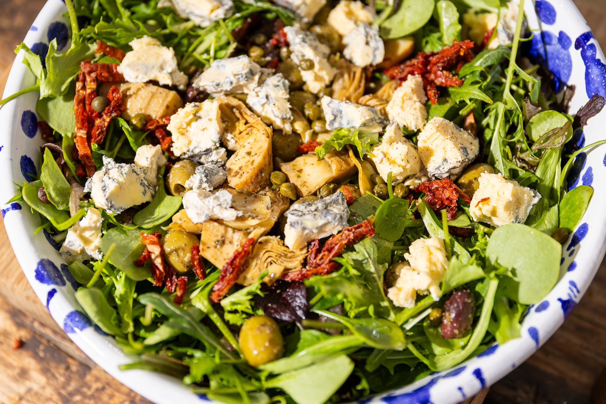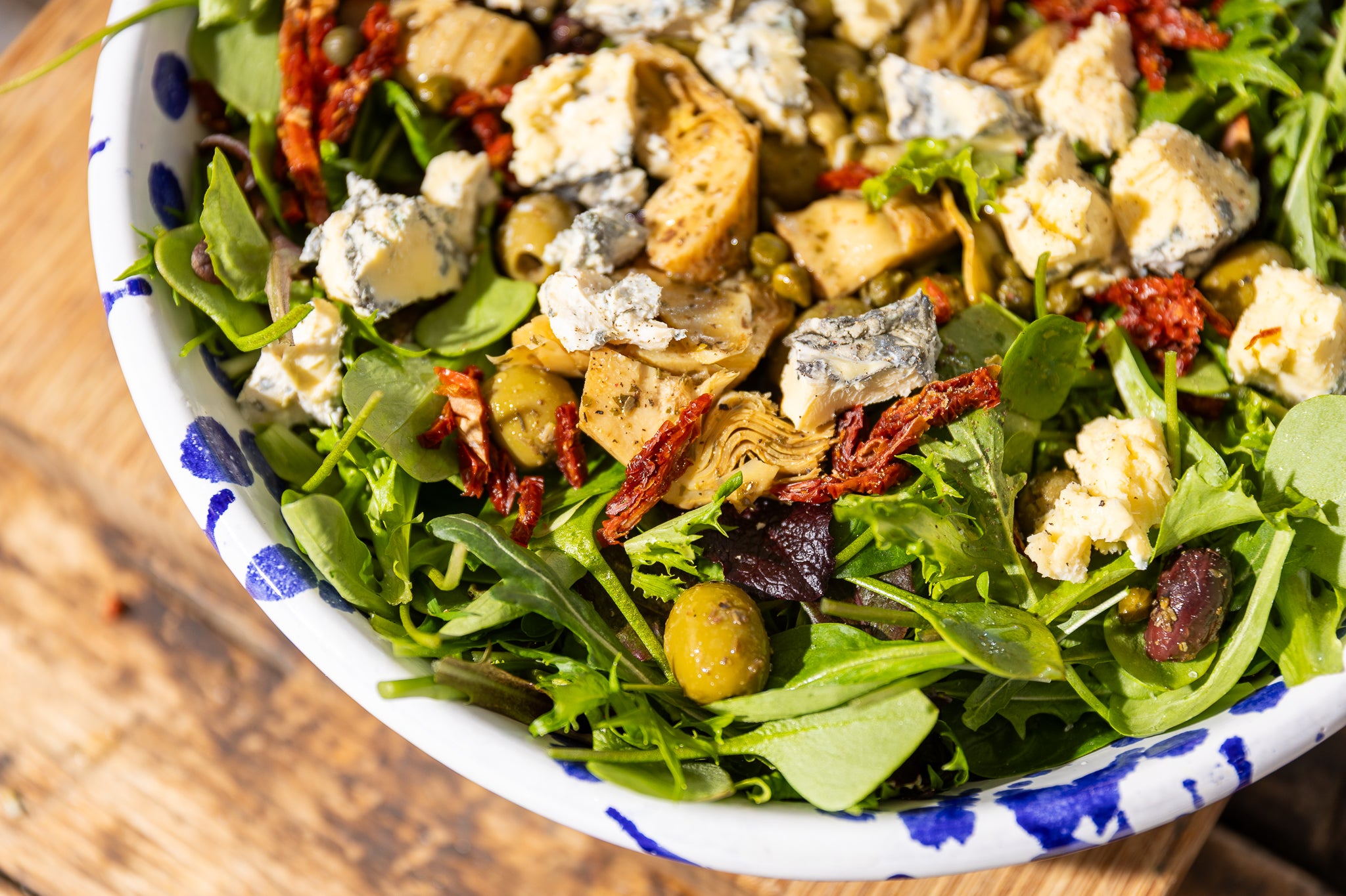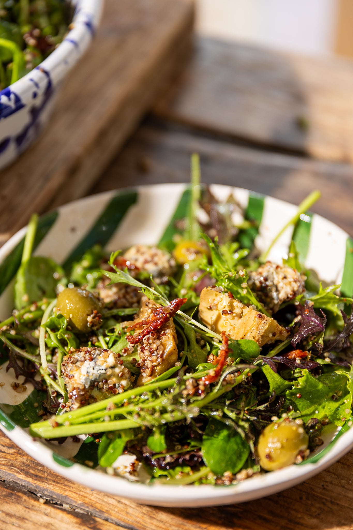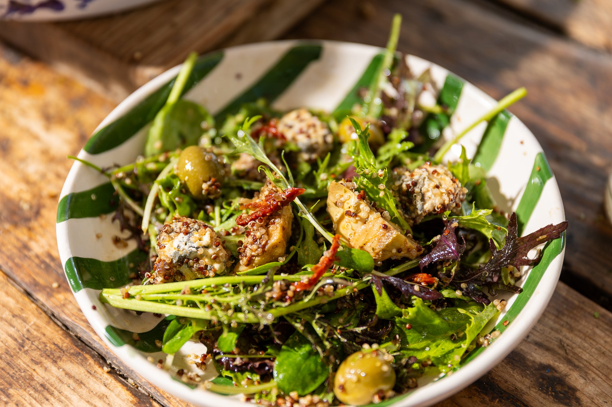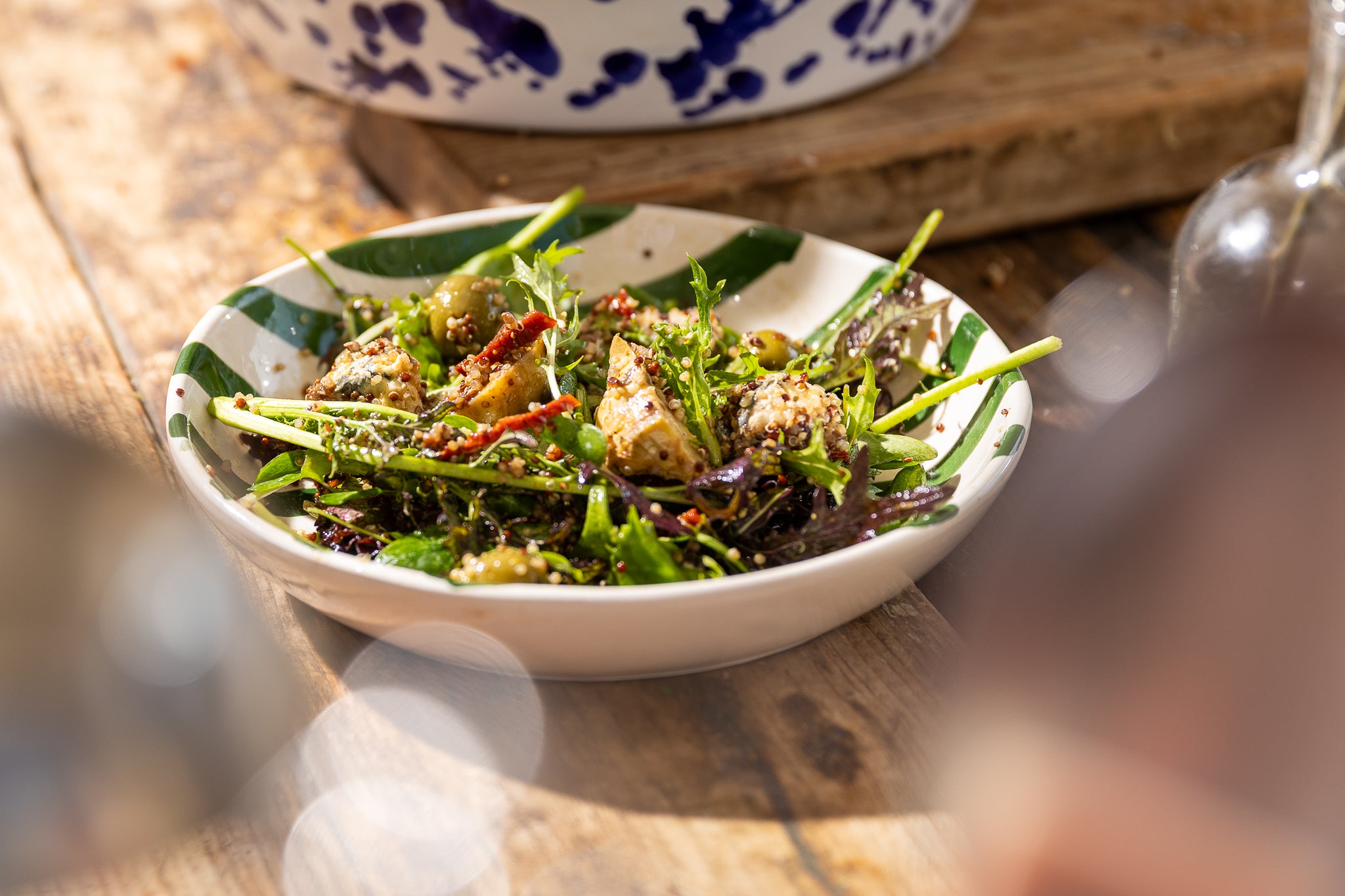 Mediterrane salade met quinoa, zongedroogde tomaten, olijven en artisjok