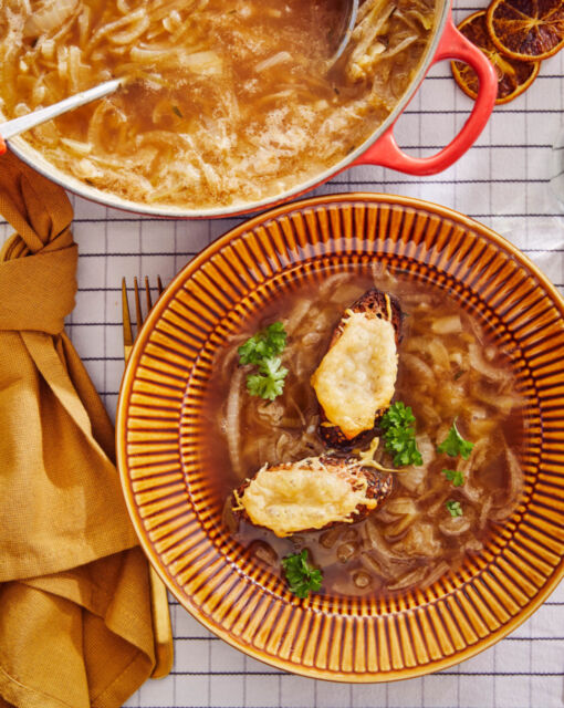 Schep een kommetje ajuinsoep uit en leg er 1 of 2 toastjes op en werk af met fijngesneden peterselie.