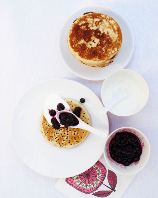 Serveer met een flinke schep Griekse yoghurt, blauwe-bessencoulis en een lepel zure room.