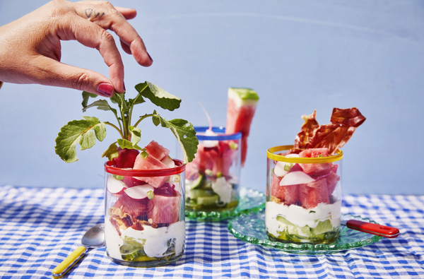Werk af met een radijs, watermeloen en krokante ham.