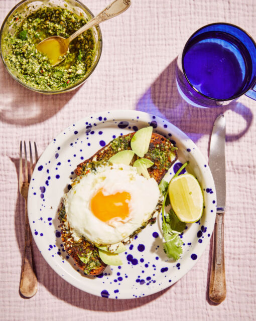 Avocado toast met gebakken koriander-pesto eitje