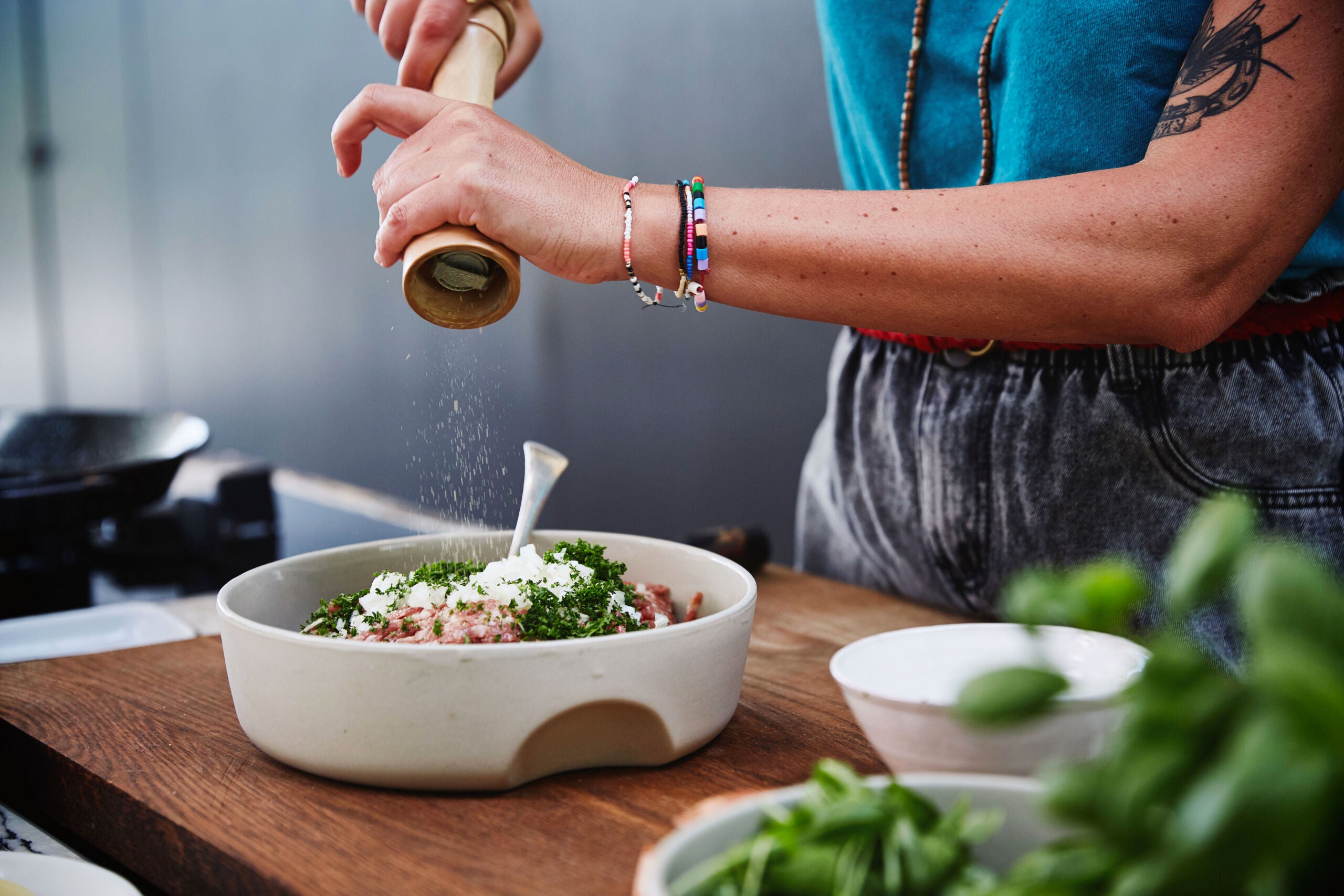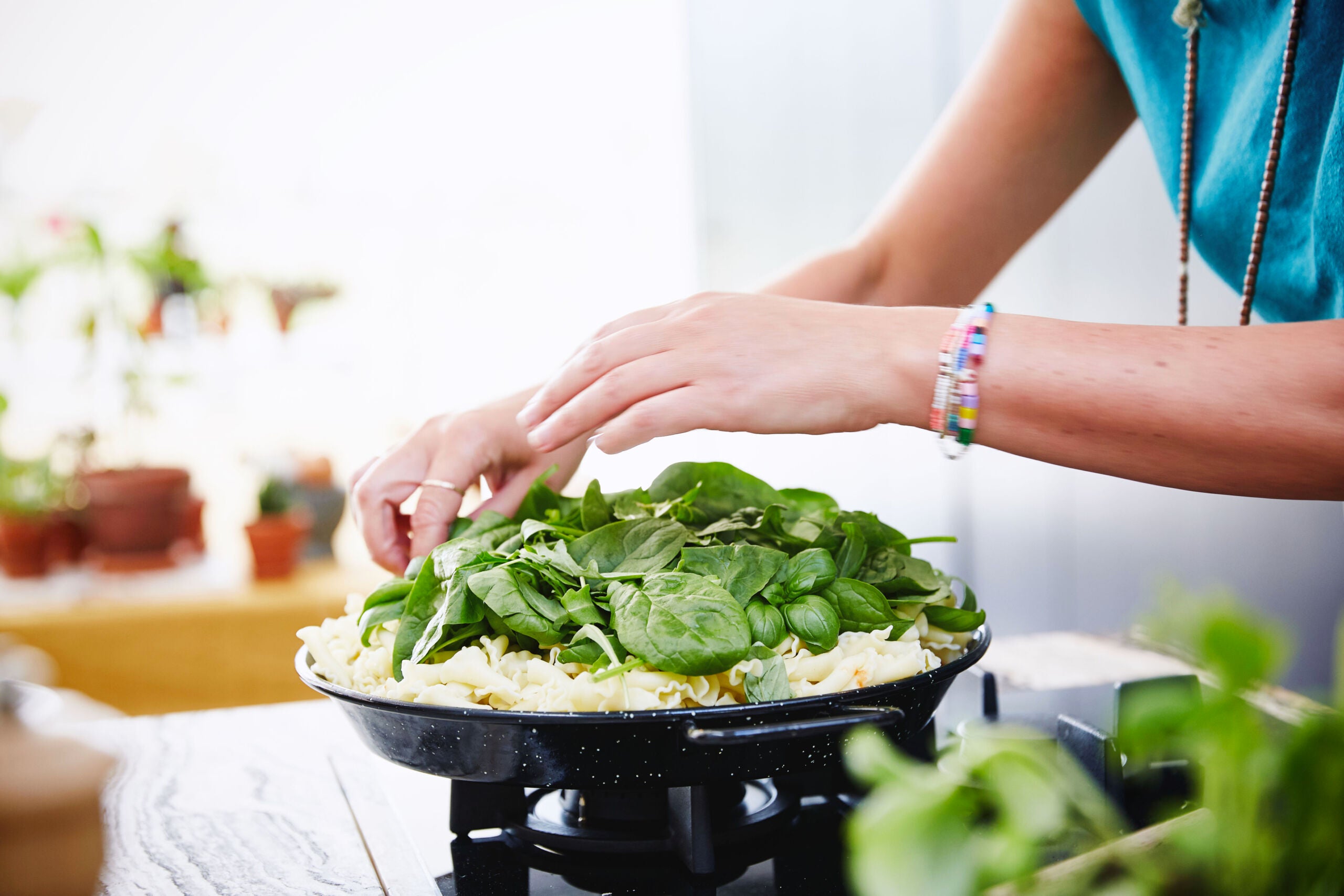 Ballekes in tomatensaus met pasta, spinazie en gegratineerde mozarella
