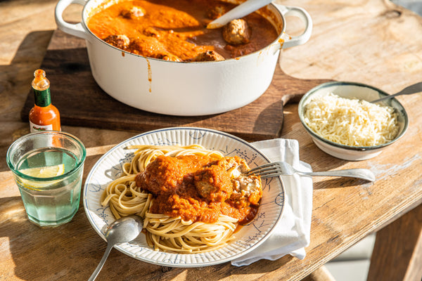 Verdeel de pasta op de borden, doe er een flinke schep saus met ballekes op en werk af met de geraspte Parmezaanse kaas.