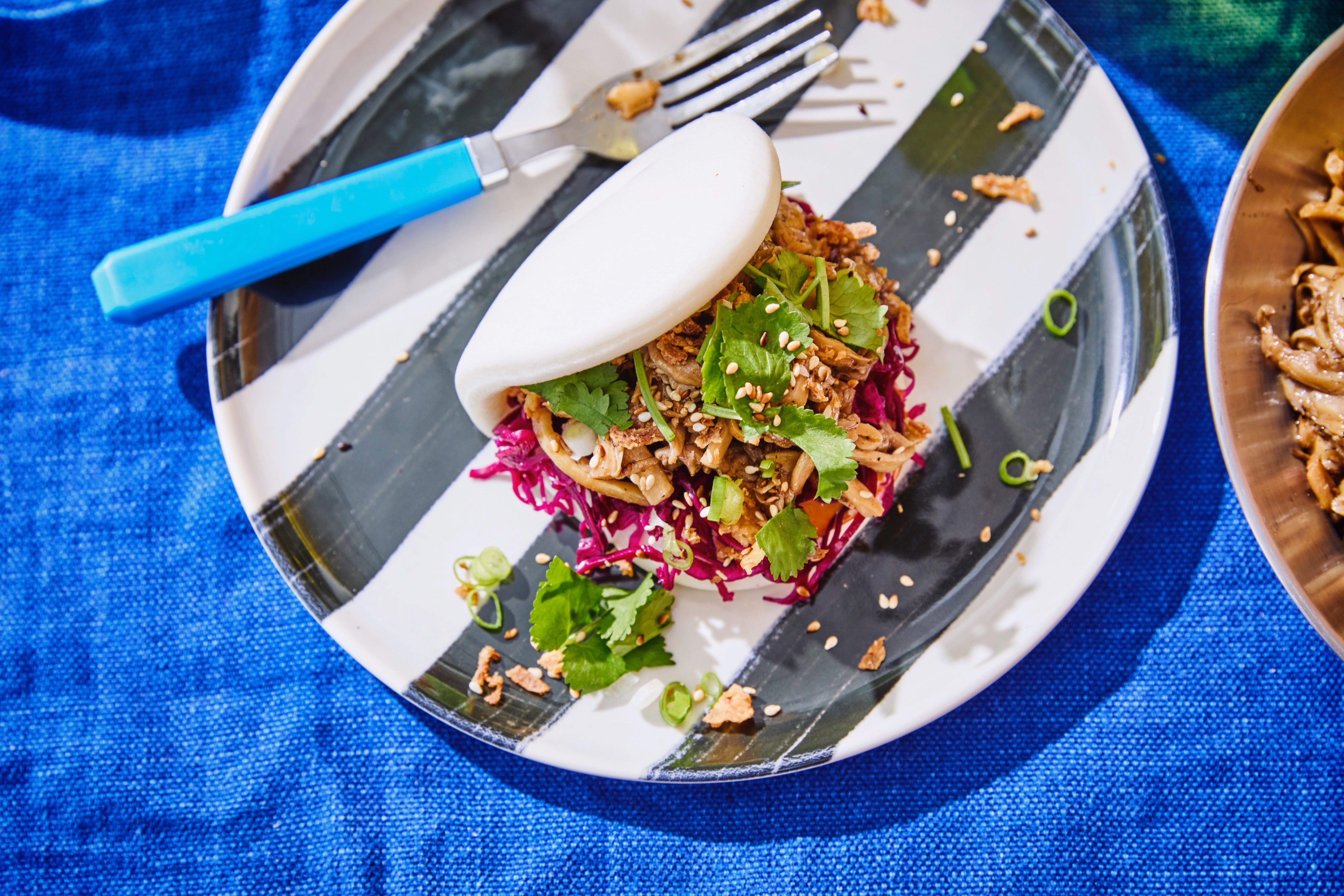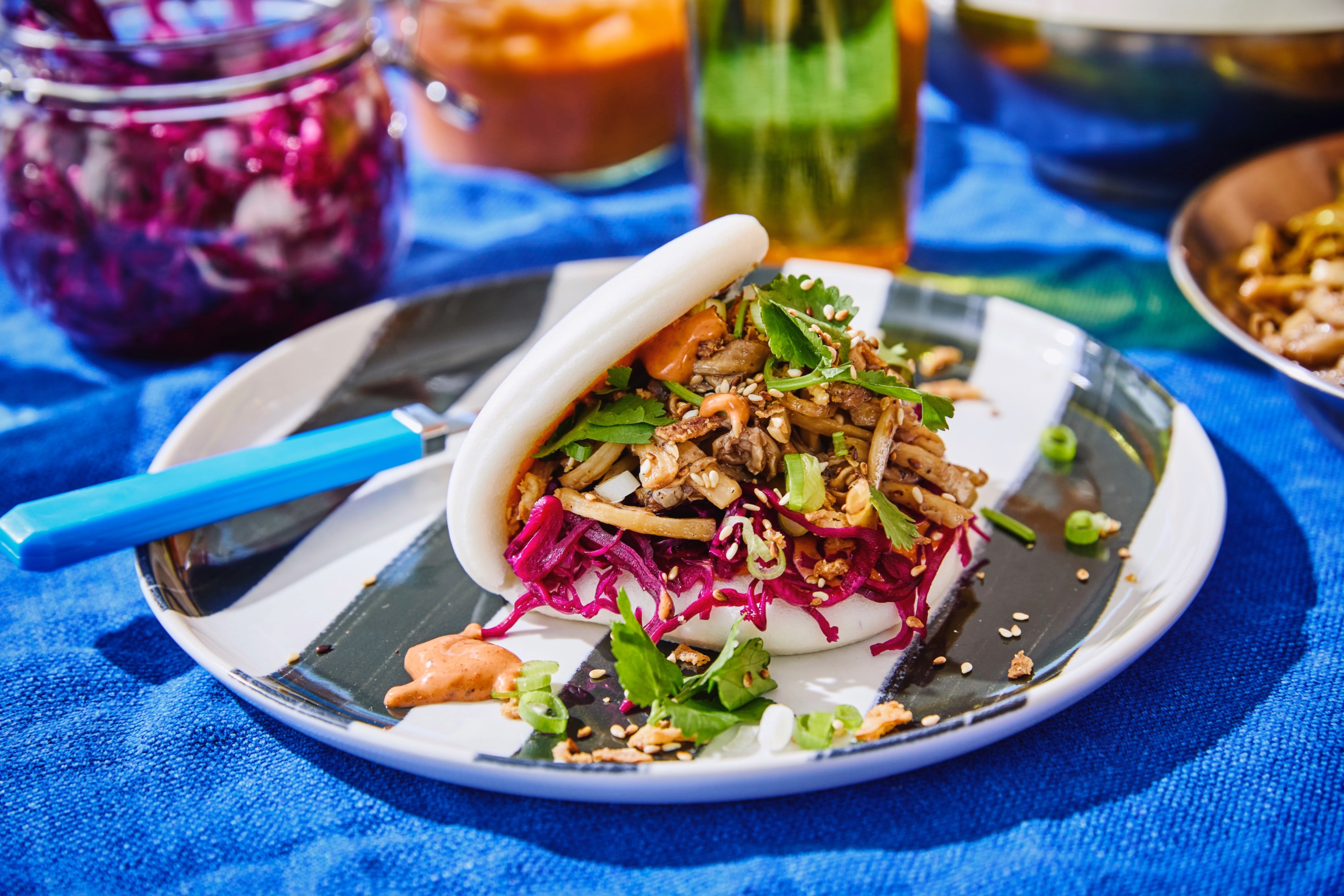 Bao Buns met Pulled Paddenstoelen, Rodekoolpickle & Gochujang-saus