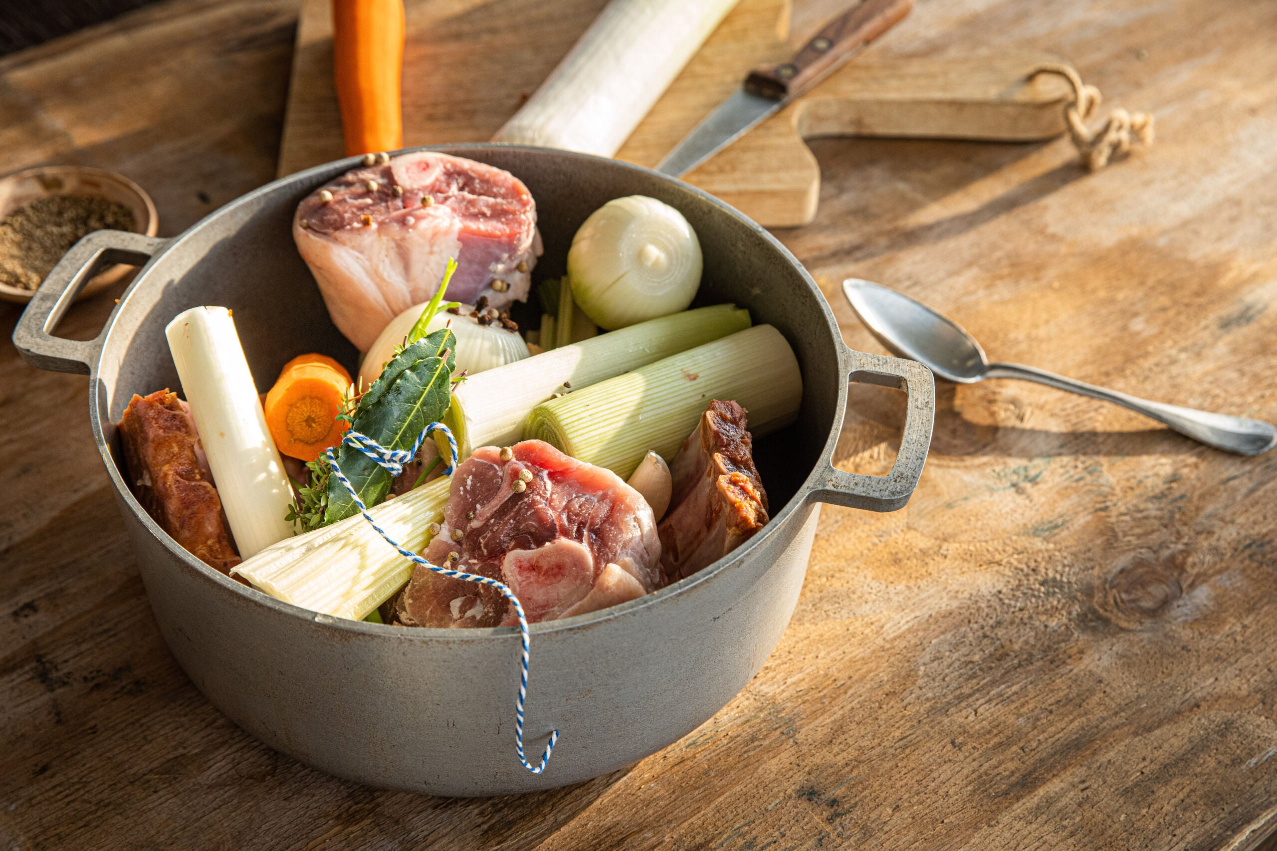 Wat heb je nodig?1 varkensschenkel (600 g ongeveer) in 3 gezaagd door beenhouwer.