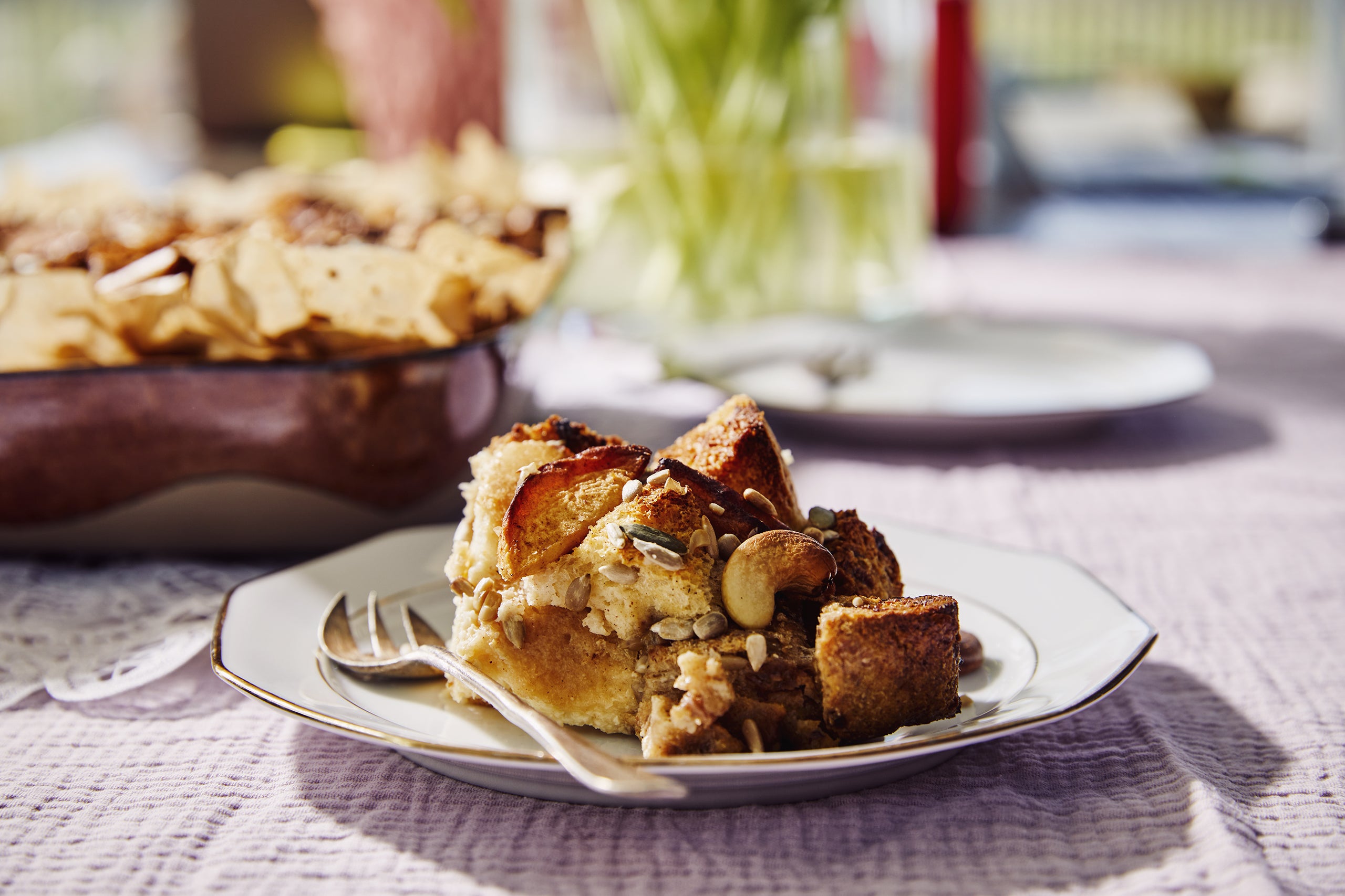 Mix eieren, melk met honing en vanille onder elkaar en giet van links naar rechts over het geheel in de schaal.