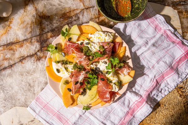 Burrata, parmaham, meloen en gremolata