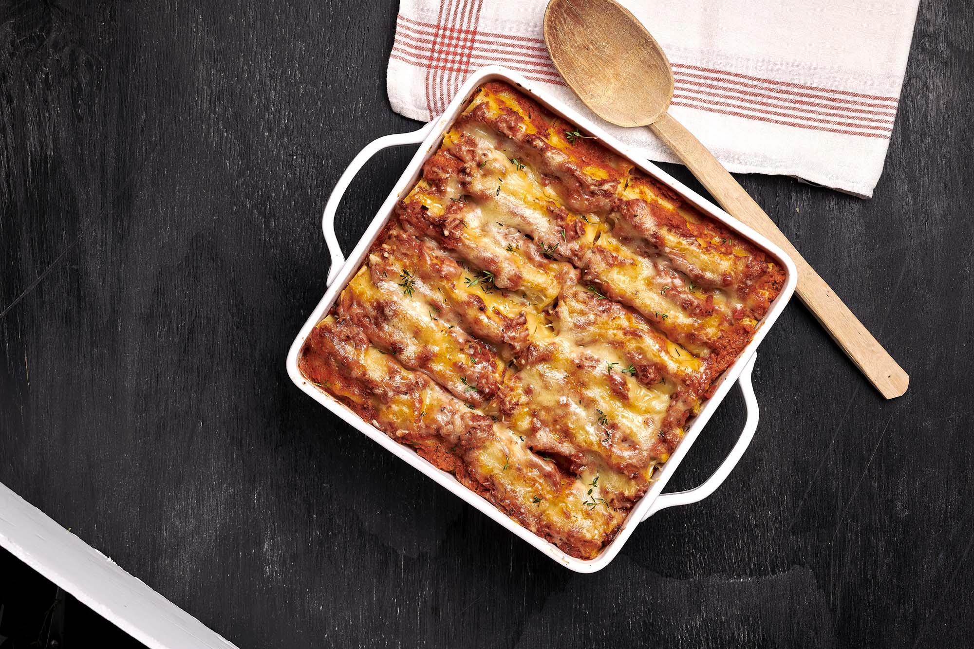 Een heerlijk winters ovengerecht boordevol smaak: een vulling van pompoen, pastinaak, ricotta en gekruid gehakt, overgoten met een snelle saus en afgewerkt met geraspte kaas. Perfect voor een gezellig ...