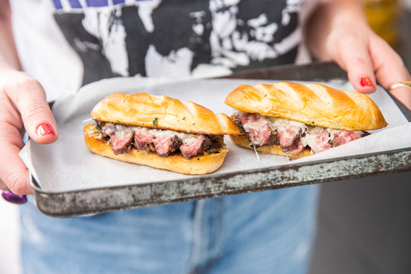 Beleg royaal de 4 onderkanten van de broodjes met de gekarameliseerde ajuin, entrecote reepjes en de geraspte provolone. Steek ze terug in de oven en bak nog 2 à 3 minuten in de oven tot de kaas gesmolten is.