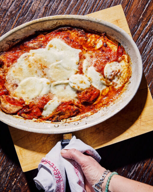 Zet de oven op maximum en op grillstand. Zet de pan met kip 10 tot 15 minuten in de oven. Serveer als de kaas een gouden korstje heeft.