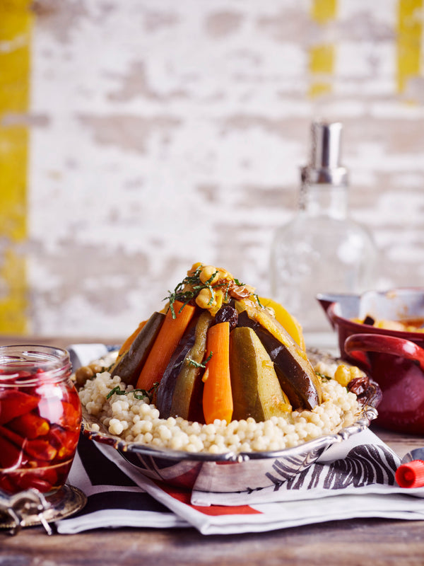 Als er niets op verpakking staat doe je in een kom 1 deel griesmeel en 2 delen water, zet er een bord op en laat 5-tal minuten rusten. Roer los met een vork. Doe het griesmeel in een grote schaal, leg er in cirkel alle groenten op en in het midden de kikkererwten en rozijntjes, hou de bouillon apart om aan tafel te serveren.