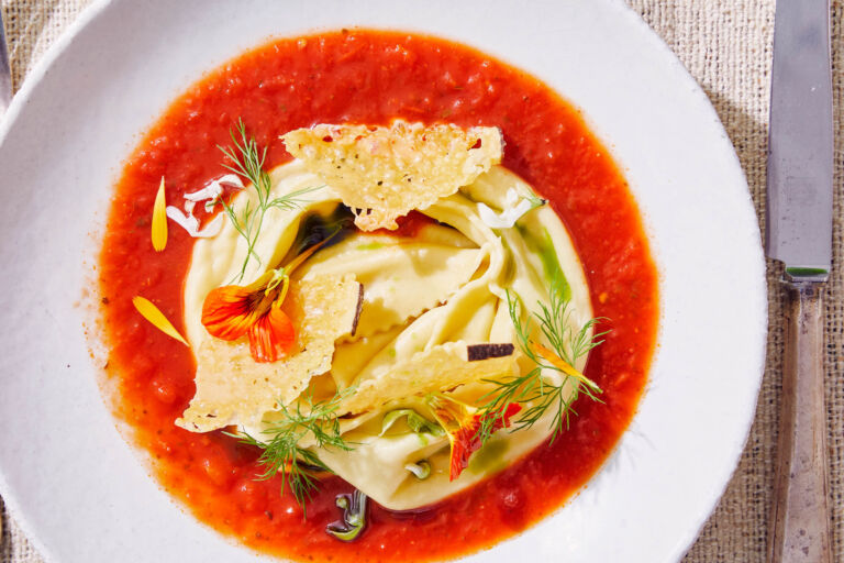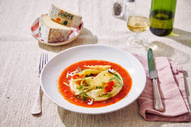 Crown ravioli met Comté, geroosterde knolselder en arrabiata
