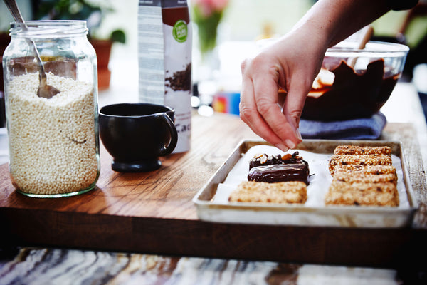 Is het geheel nog te plakkerig voeg dan wat extra millet toe; is het te droog, voeg extra notenpasta toe.