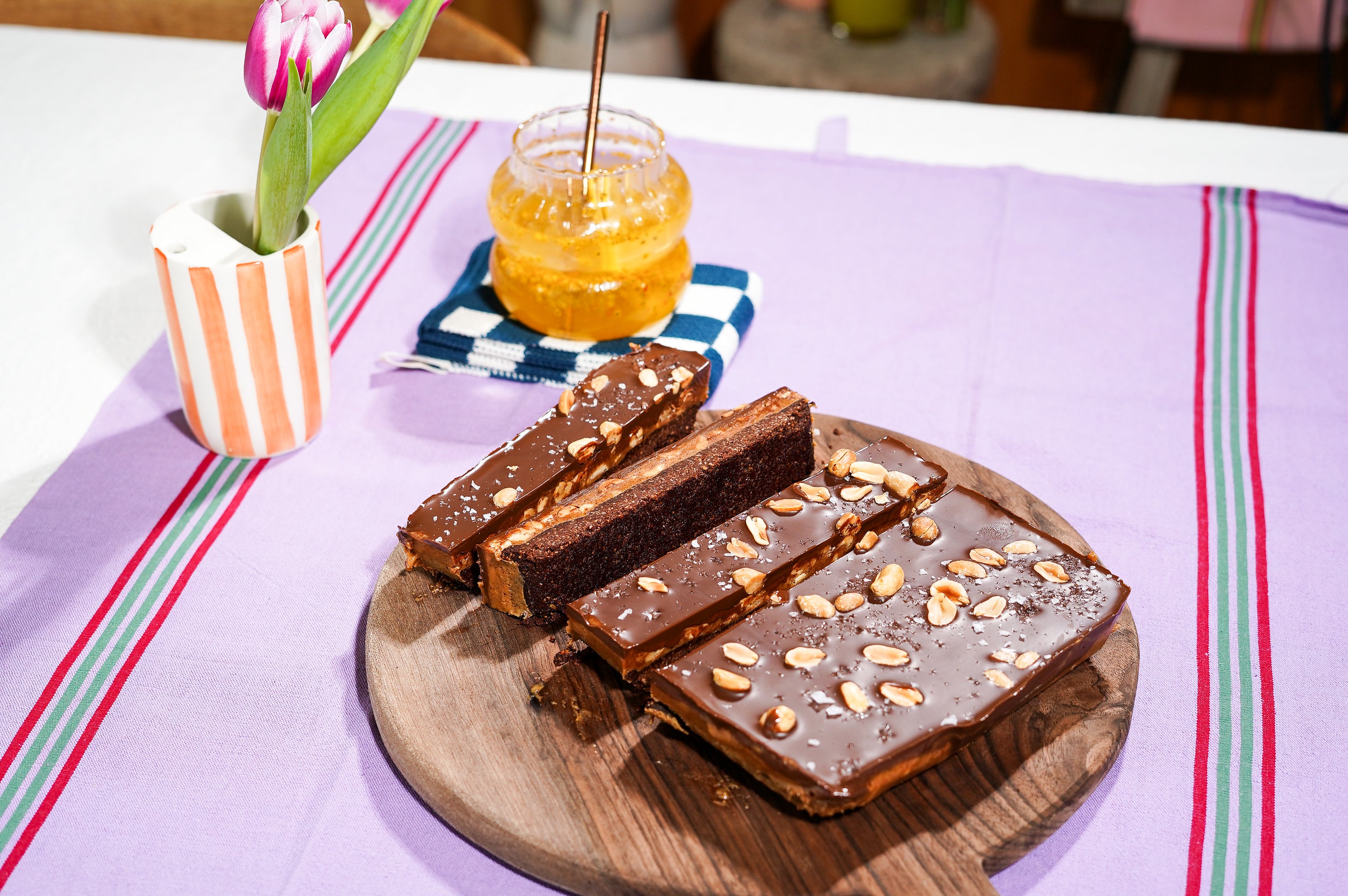 - Snij met een warm mes voor mooie snickersrepen.