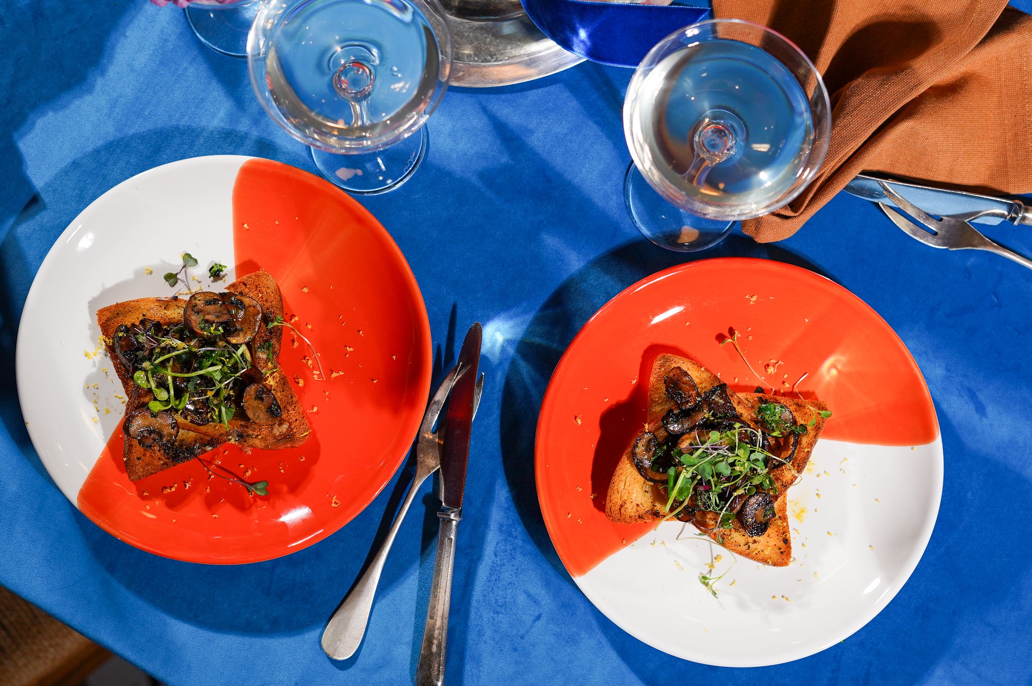 Afwerken en serveren: Verdeel de gebakken paddenstoelen over de warme toastjes met geitenkaas.