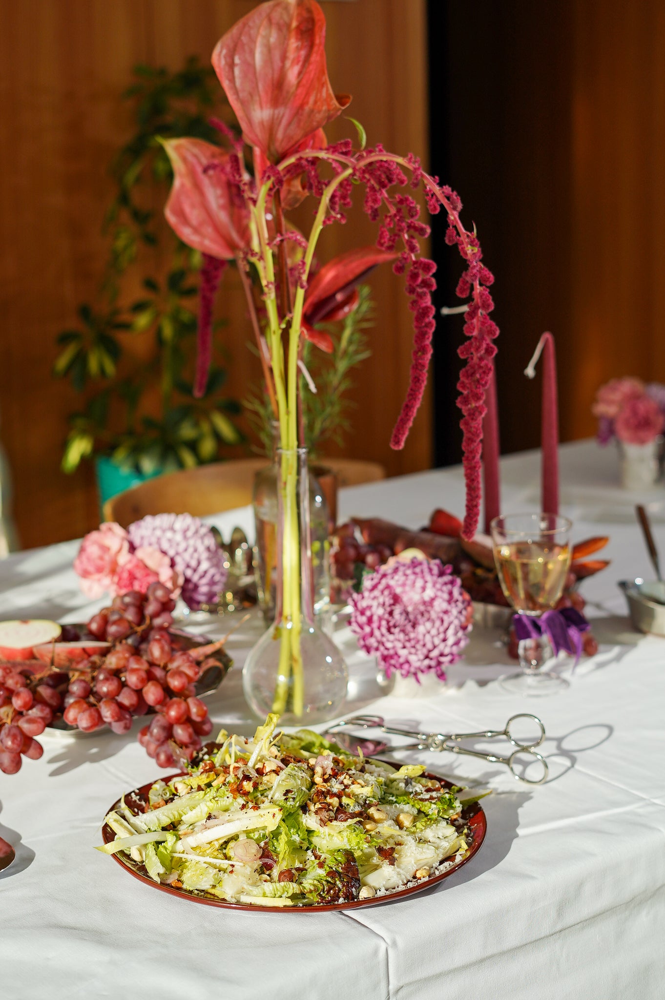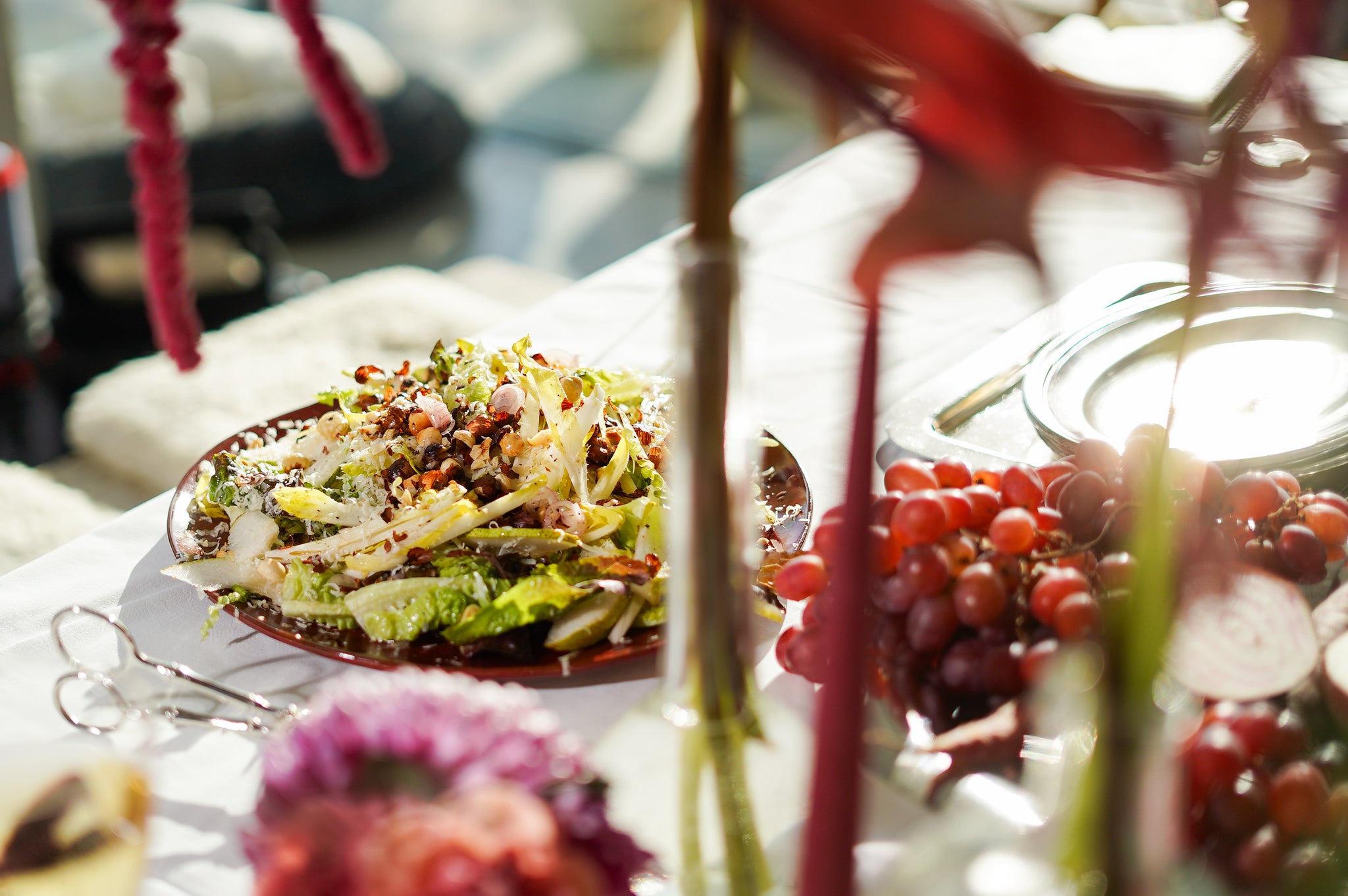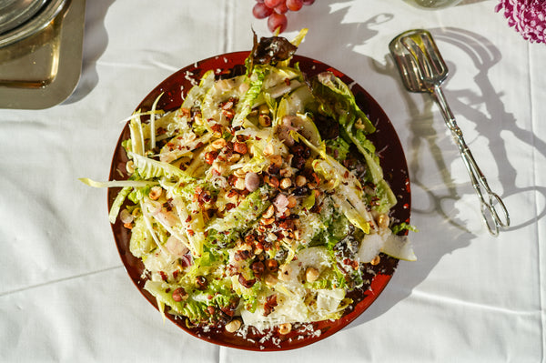 Giet de vinaigrette pas net voor het serveren over de salade zodat de blaadjes knapperig blijven.