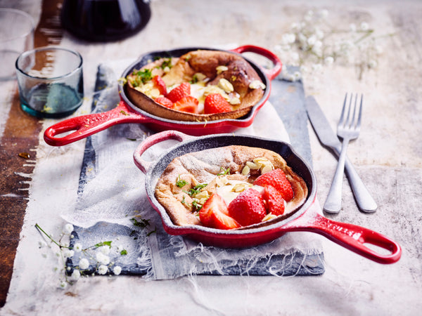 Fluffy pannenkoek met aardbeien, yoghurt en amandelen