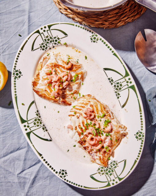Gebakken kabeljauw met witte wijnsaus en Noordzee garnalen