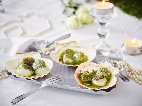 Dep de Sint-Jacobsoesters droog met wat keukenrol en leg er 3 per persoon in de schelpen.