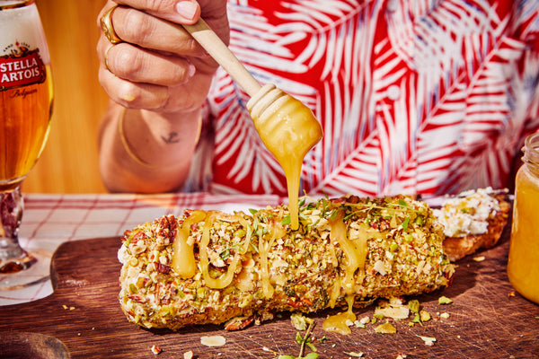 Strooi de geroosterde amandelschilfers, grof gehakte pecannoten, pistachenoten op een plaat. Rol de geitenkaasrol in de gehakte noten totdat hij gelijkmatig bedekt is. Druk de noten goed aan. Druppel honing over de geitenkaasrol en bestrooi het geheel met tijmblaadjes.