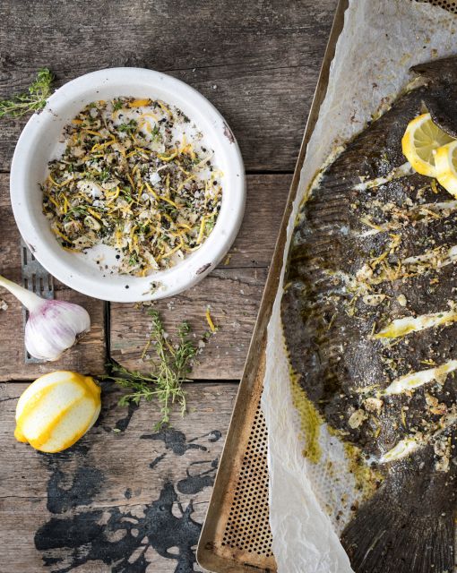 Omdat we de vis langs beide kanten willen kruiden zorgen we ervoor dat het bakpapier ook olijfolie krijgt. Strooi op het beoliede bakpapier een deel van het kruidenzout en verdeel gelijkmatig. Leg de griet op de bakplaat met kruiden met de gleuven naar boven. Strooi het zout rijkelijk op de bovenkant van de vis, en zorg dat de gleuven ook gevuld zijn met de kruiden. Zo kunnen de aroma’s zich prachtig vermengen met de griet.