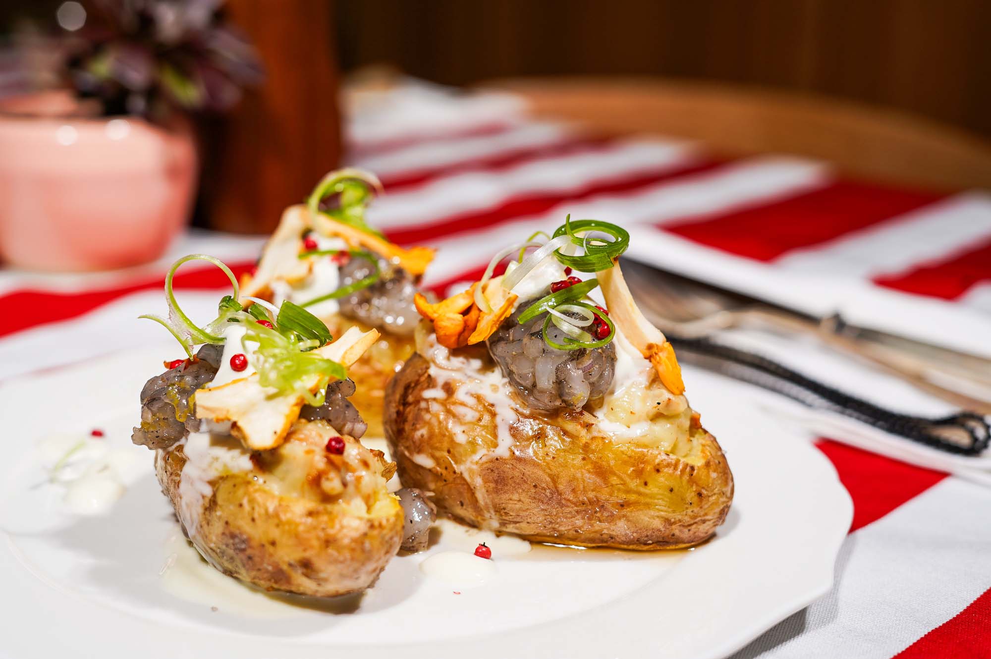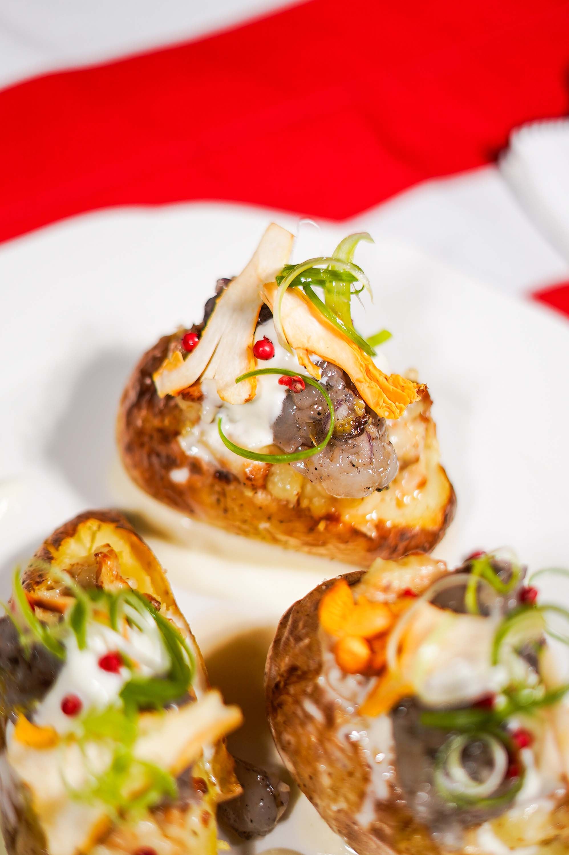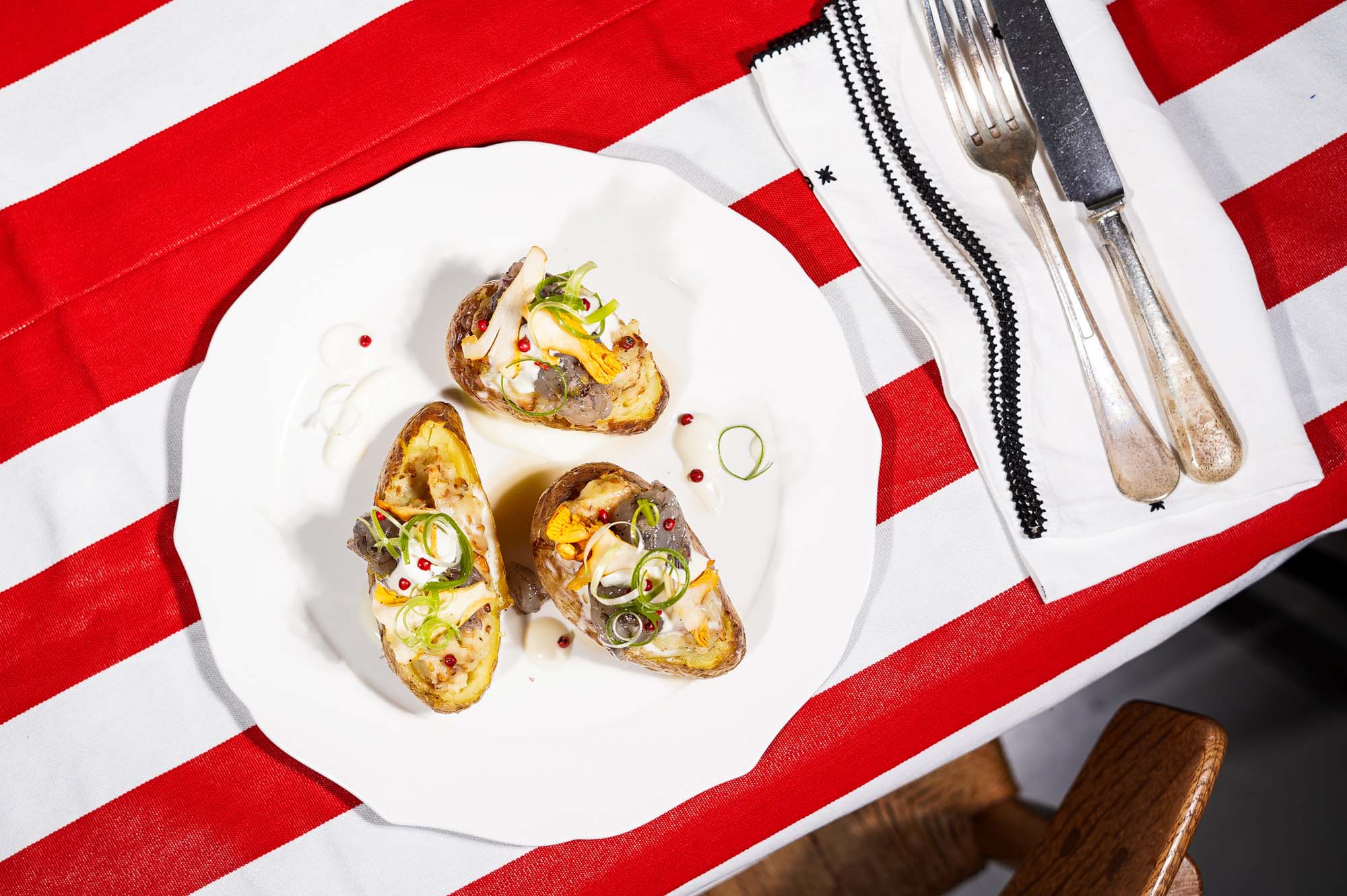Verdeel de aardappelen over de 4 borden. Werk af met een lepeltje zure room, een quenelle van de tartaar, enkele schijfjes girolle en wat roze peper.