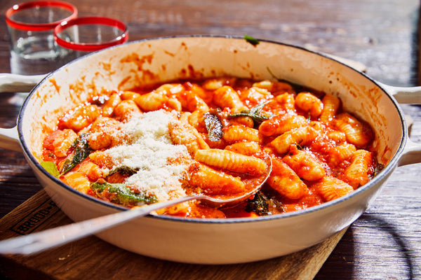Verwarm wat olie in een grote kom, doe er de salie bij en blus met tomatensaus. Eens het kookt schep je er de gnocchi op, meng en werk af met kaas. Ik eet daar graag wat pittige rucola bij! 😉 Probeer ook met boter en gebakken salie of met basilicum.