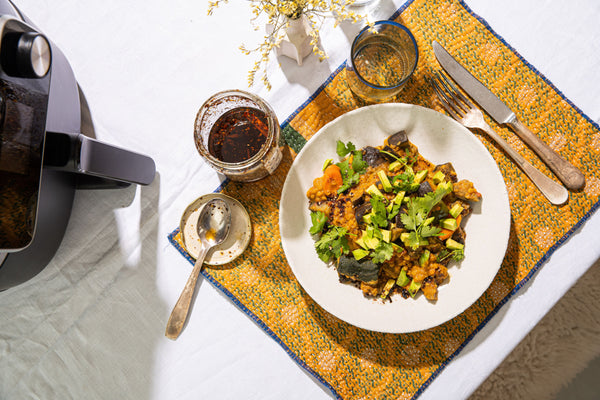 om deze groente curry te bewaren? Je kan de groentencurry 4 dagen afgedekt in de koelkast bewaren of afgedekt invriezen. Om op te warmen laat je hem ontdooien en giet hem weer in bak accessoire van de Airfryer. Laat 25 min opwarmen op 140°, roer af en toe. Werk opnieuw af met je toppings naar keuze.