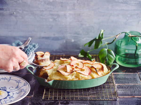 Bereid je aardappelpuree en verdeel schepjes op de appelmoes.