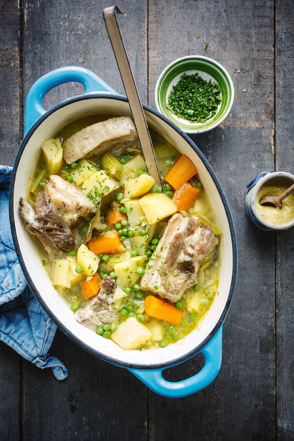 Meng de ribbetjes en de erwten door de hutsepot en laat nog even doorwarmen.