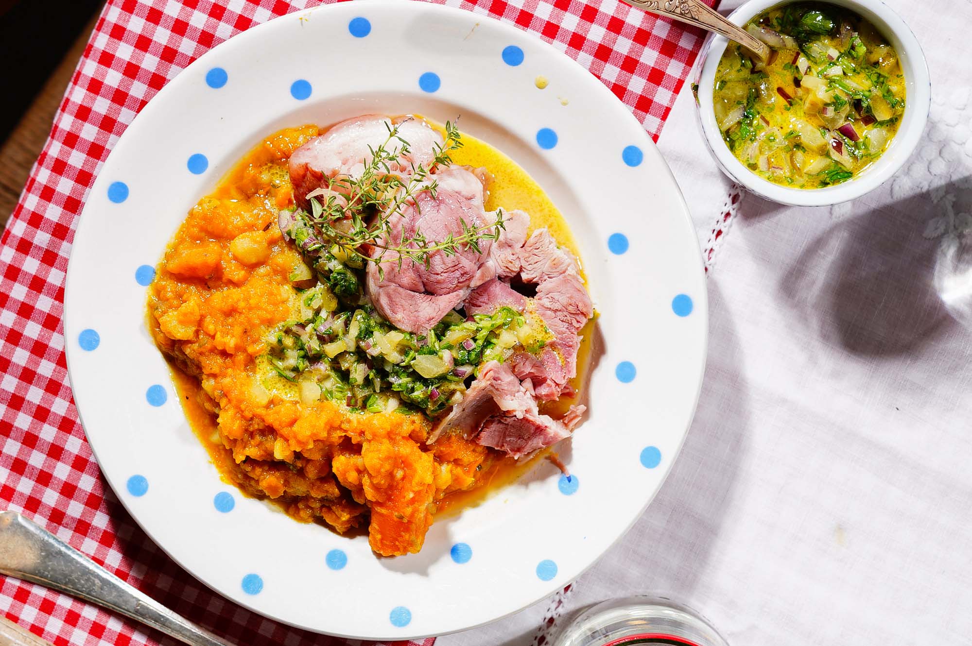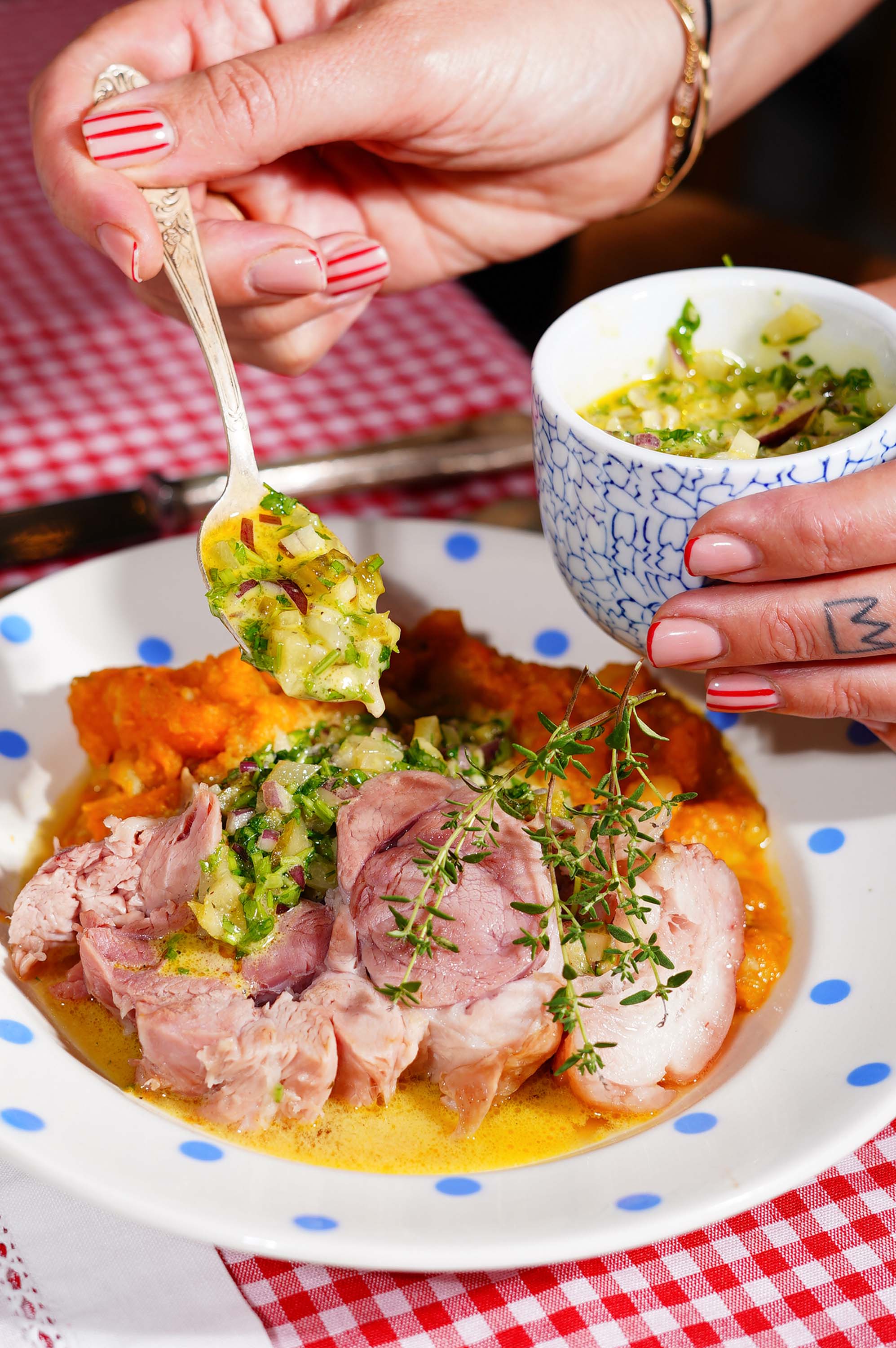 Serveer een lepel hutsepot, leg daar de plakjes ham op en werk af met de salsa.
