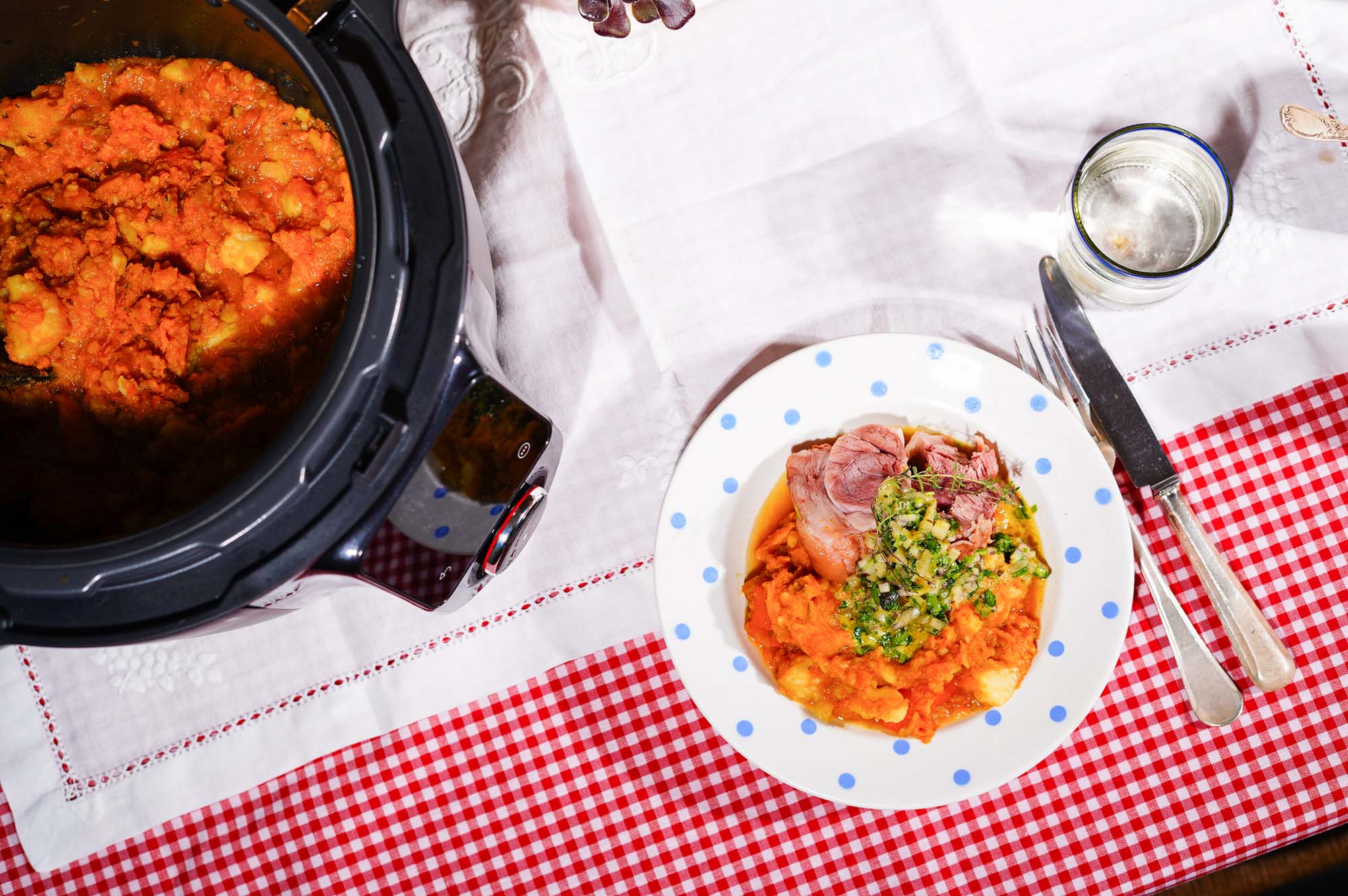 Schil ondertussen de pompoen, aardappelen, zoete aardappelen en wortels, en snijd alles in grote stukken. Voeg toe aan de Cookeo.
