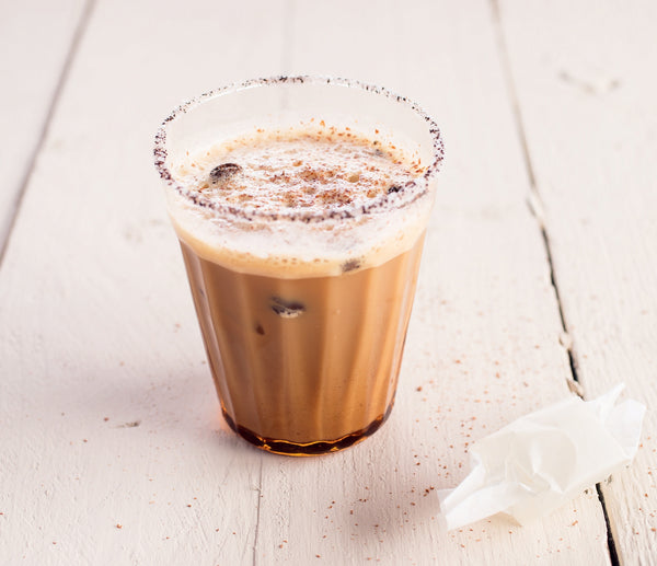 Doe een beetje honing op je vinger en wrijf over de rand van het glas. Draai het glas in de koffiesuiker, zodat je een gesuikerde rand krijgt.