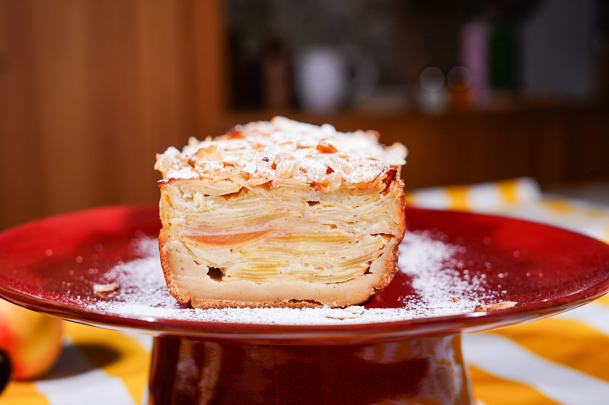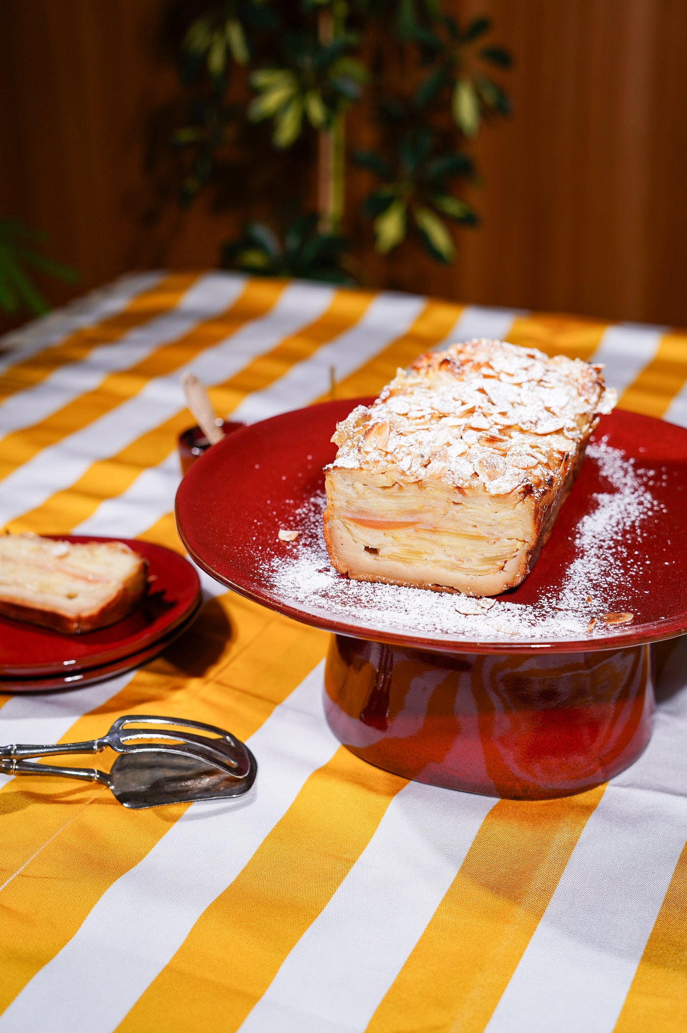 Schep het mengsel in de cakevorm en druk lichtjes aan. Werk de bovenkant af met de overgehouden appelplakjes in trapvorm en bestrooi met geschaafde amandelen.