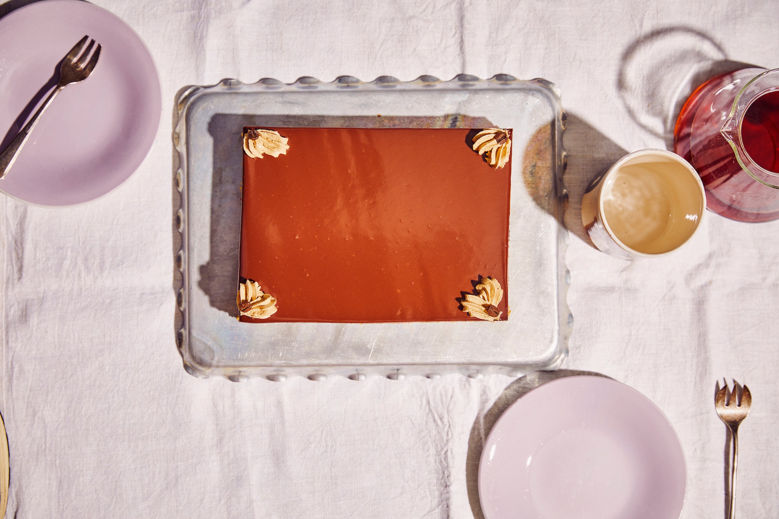 Vul een hoge maatbeker met kokend water en neem een chef mes. Leg taart weer op plank. Nu gaan we de zijkanten pareren, mooi gelijk snijden. Neem het mes uit het water, droog af en snij telkens een zijkant af. Voor elke kant steek je mes weer in het water, droog af, snij… Steek met een paletmes onder de taart en zet op een mooie schotel. Werk de hoekjes af met hartjes boterroom en koffieboontjes.
