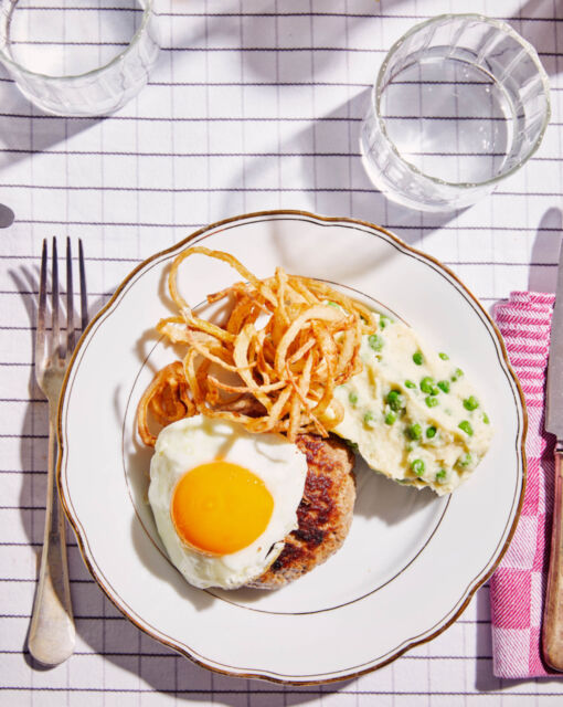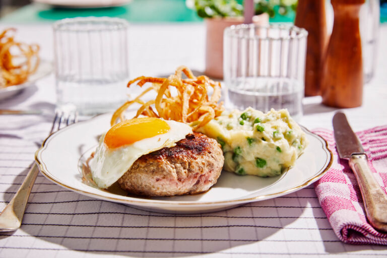 Serveren: Serveer de puree met de hamburger met kaas, leg daarop het spiegelei en de uienringen. Smakelijk!