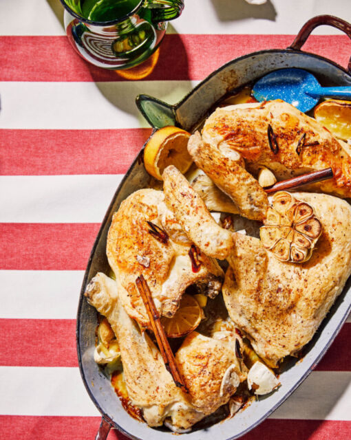 Kip uit de oven met kaneel, chili en citroen, met cheesy erwten en bloemkool in tomatensaus