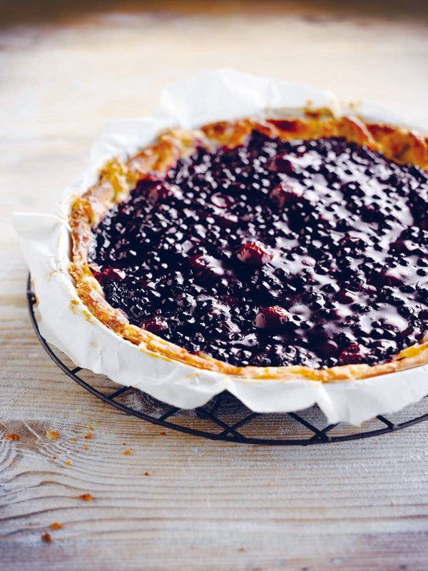 Haal de taart uit de koelkast en strooi er de krieken en de rauwe vlierbessen op. Giet het sap erover.