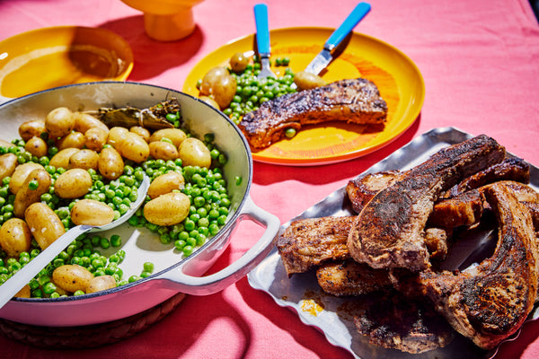Lamskoteletjes met garam masala, yoghurt, erwtjes en krieltjes