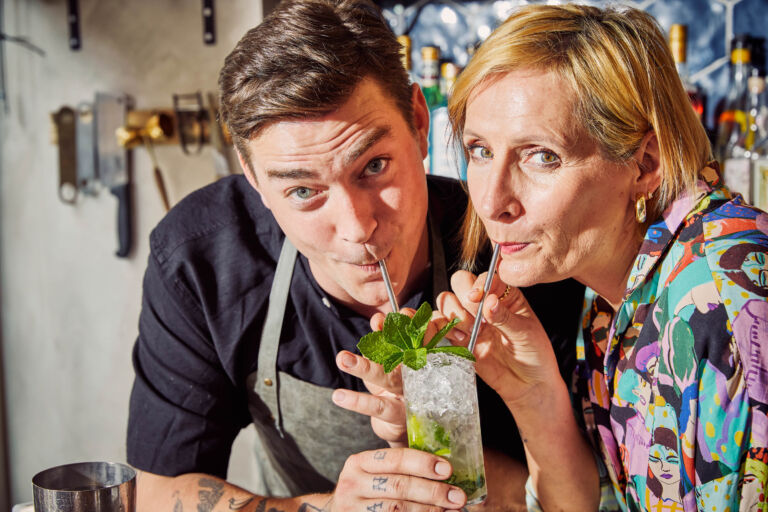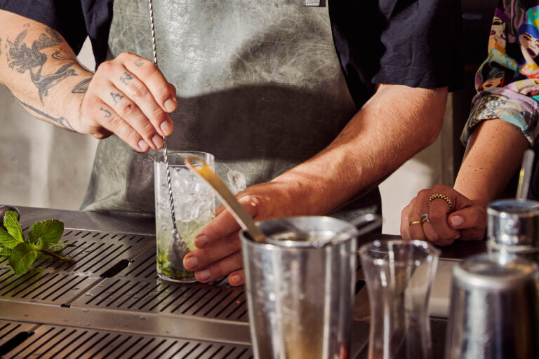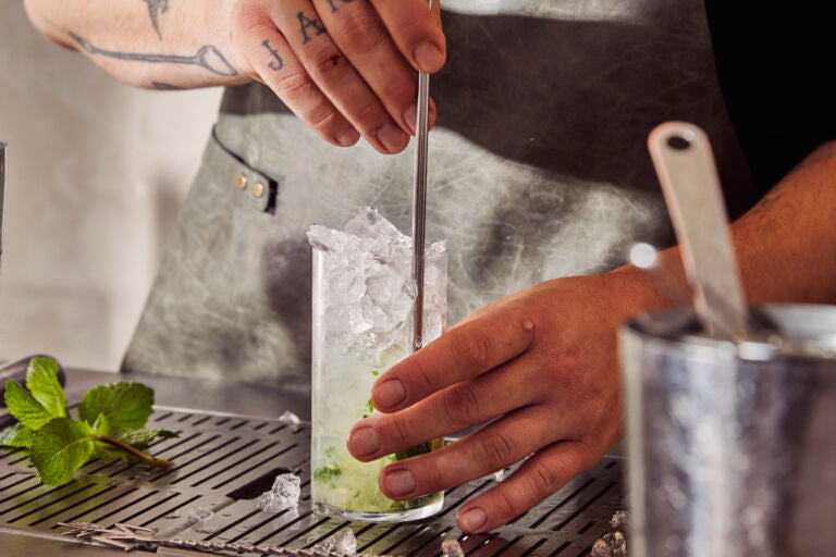 Als je geen crushed ice hebt, neem dan een paar ijsblokjes in een handdoek en sla erop met een zwaar voorwerp totdat ze fijngestampt zijn. Roer alles goed door met een barlepel. Top eventueel af met een beetje champagne voor een feestelijke touch. Garneer met een takje munt en een schijfje limoen.