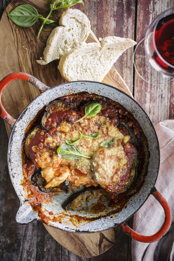 Leg nog een laagje aubergines, provolone en de rest van de tomatensaus in de schaaltjes.