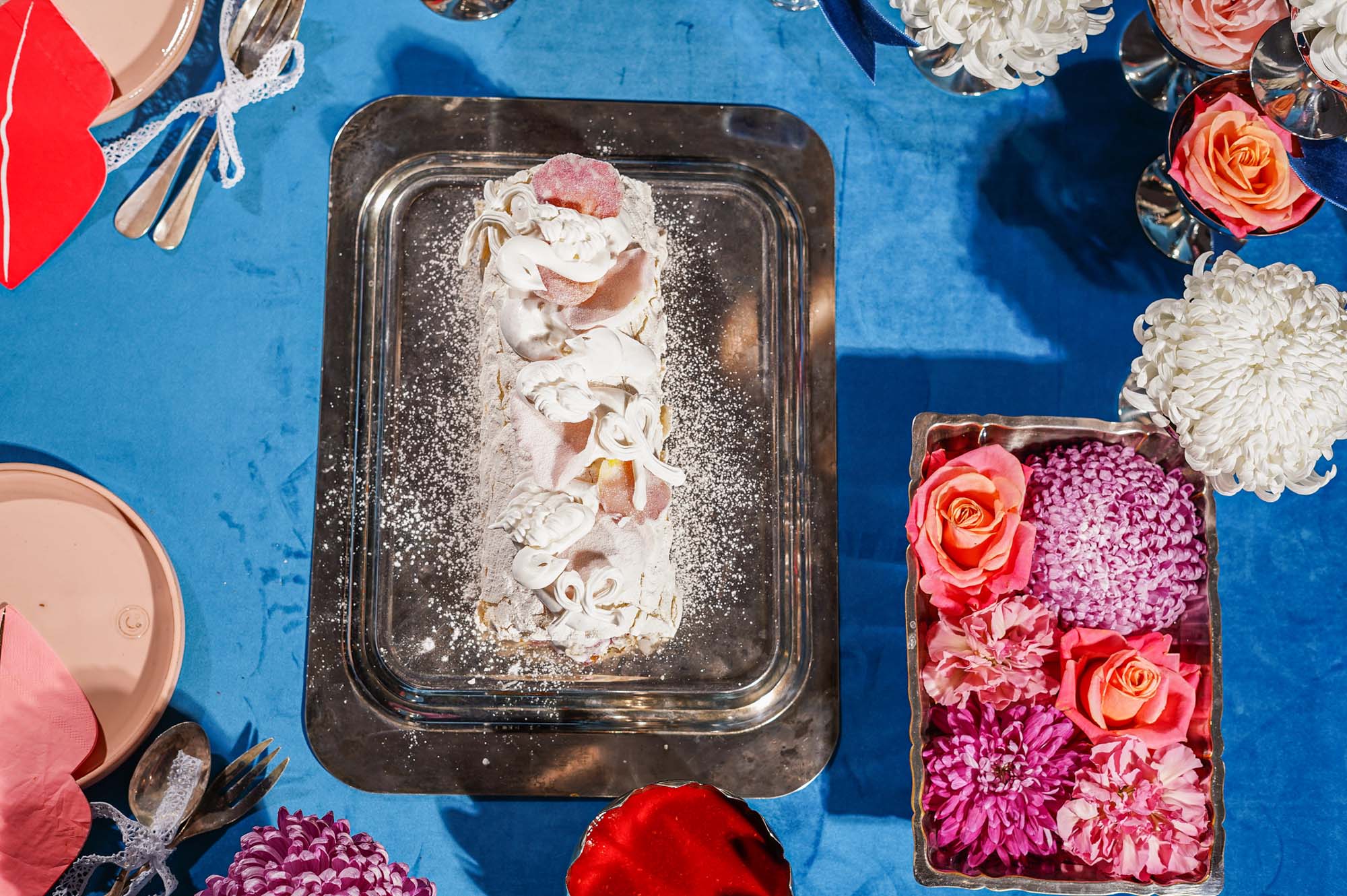 Decoratie: Gekristalliseerde roze blaadjes: Pluk de blaadjes, bestrijk dun met eiwit, rol door suiker, laat drogen op bakpapier (niet in oven), ±1 dag.
