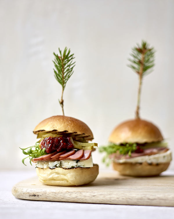Snijd de roquefort in dunne plakjes en de augurken in fijne staafjes. Open de broodjes en gril ze. Garneer elk broodje met roquefort en met 5 sneetjes eendenborst. Voeg de augurken toe en werk af met chutney en tuinkers. Steek een brochettestokje door elke burger of vervang eventueel door een klein dennetakje.