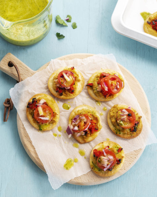 Nu nog even afwerken: 1. Snij de tomaten in fijne plakjes en meng ze met fijngesnipperde rode ui. 2. Voeg 100 milliliter appelazijn en 100 milliliter olie mengeling voor koude bereidingen samen in een maatbeker. Kruid af met peper en zout, een teentje fijngesneden knoflook en een handvol munt en peterselie. Mix het geheel met een staafmixer. 3. Haal de minipizzaatjes uit de oven en verdeel in porties. Werk af met de munt – lookdressing en de tomatensalade. Serveer de pizzaatjes meteen.