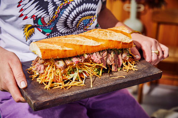 Haal het vlees min 1 uur op voorhand uit de koelkast, kruid met peper en zout en wrijf lichtjes in met beetje olijfolie. Snij alles voor de salade fijn, kruid met peper en zout en meng citroensap eronder. Snij het stokbrood in 4 gelijke delen en snij doormidden, op de bovenste stukken smeer je egaal wat beurre café de Paris en de 4 onderste stukken ga je grillen met kaas.