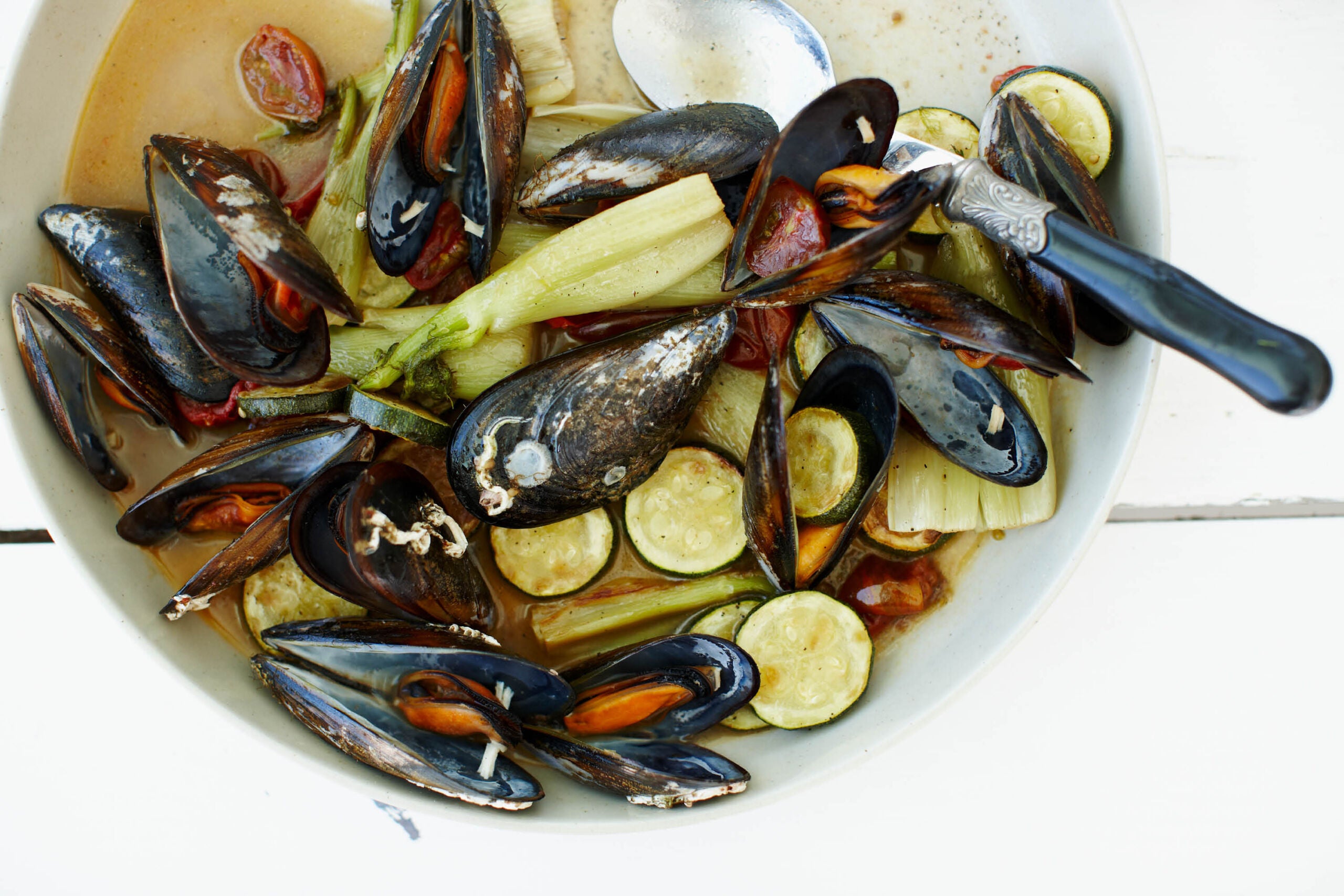 Wat heb je nodig?1 courgette 1 venkel 4 el olijfolie Peper Zout 1 kg mosselen 10-tal kerstomaatjes 100 ml vloeistof (witte wijn, Hierbas, pastis…)
