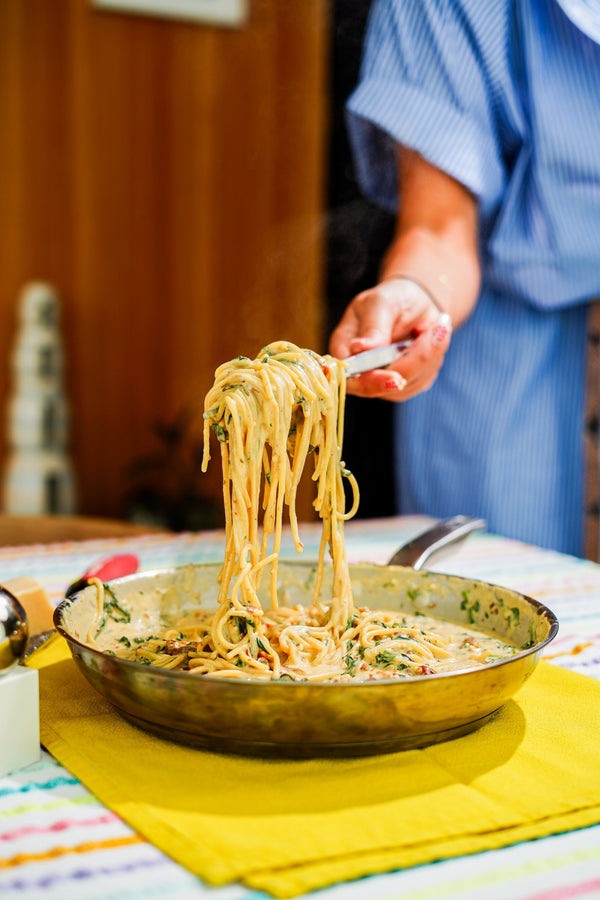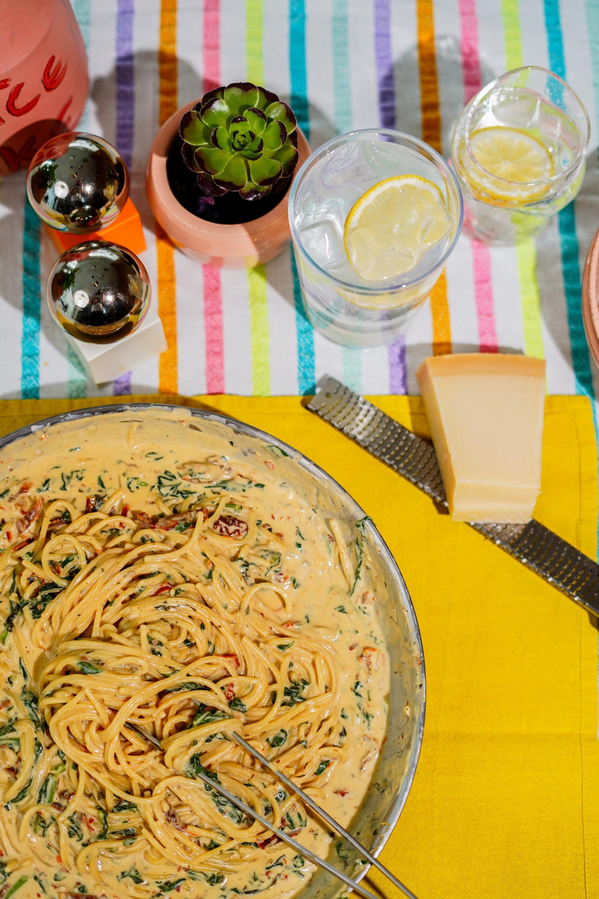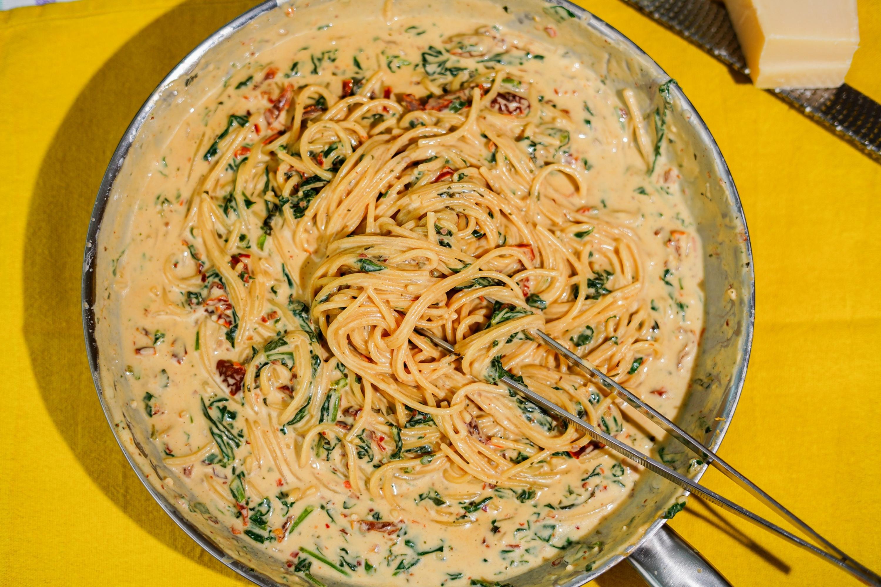 One pot pasta met zongedroogde tomaten, spinazie en roomkaas