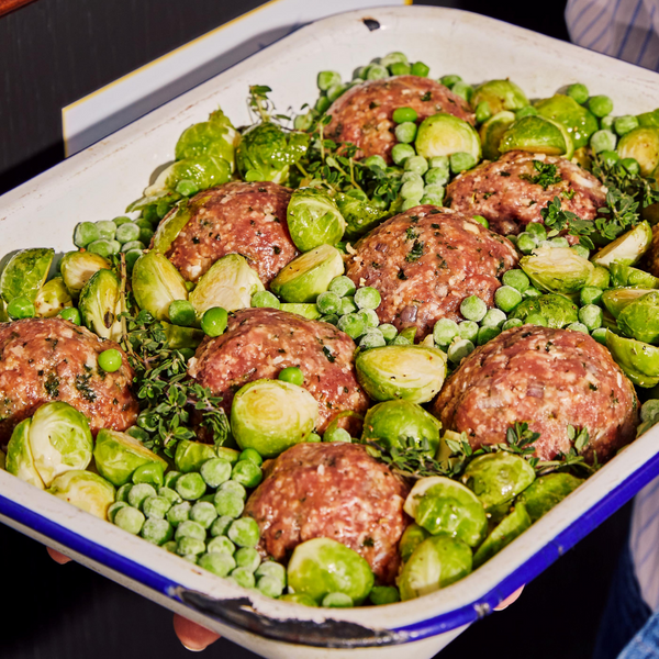 Ovenschotel met spruitjes, erwten en gehaktballetjes